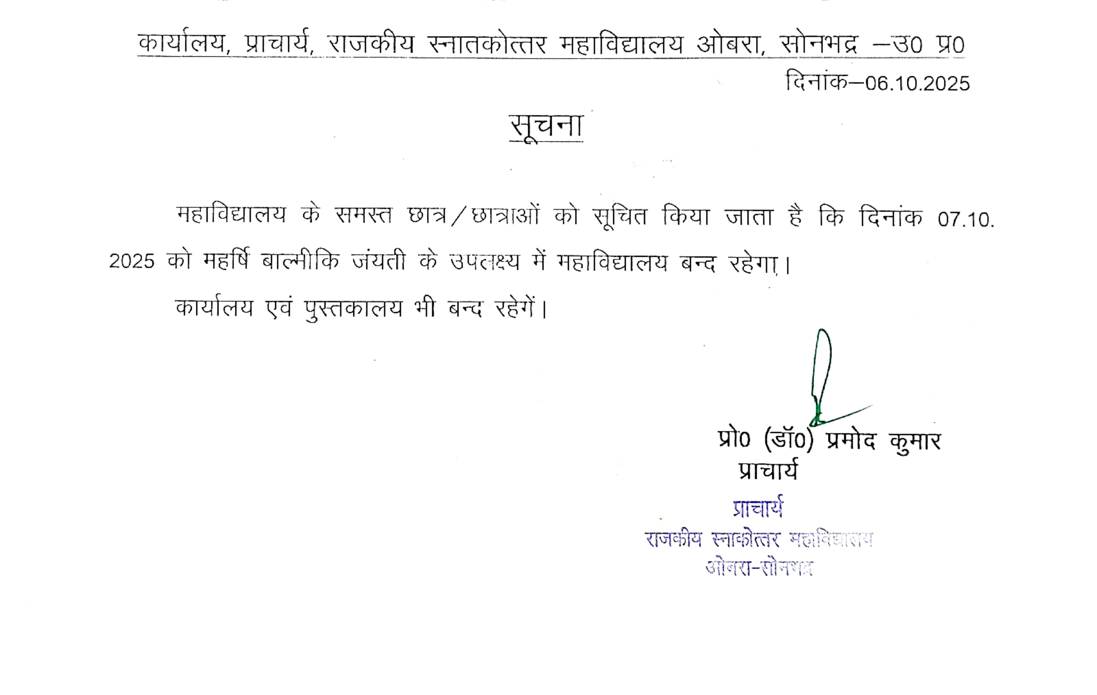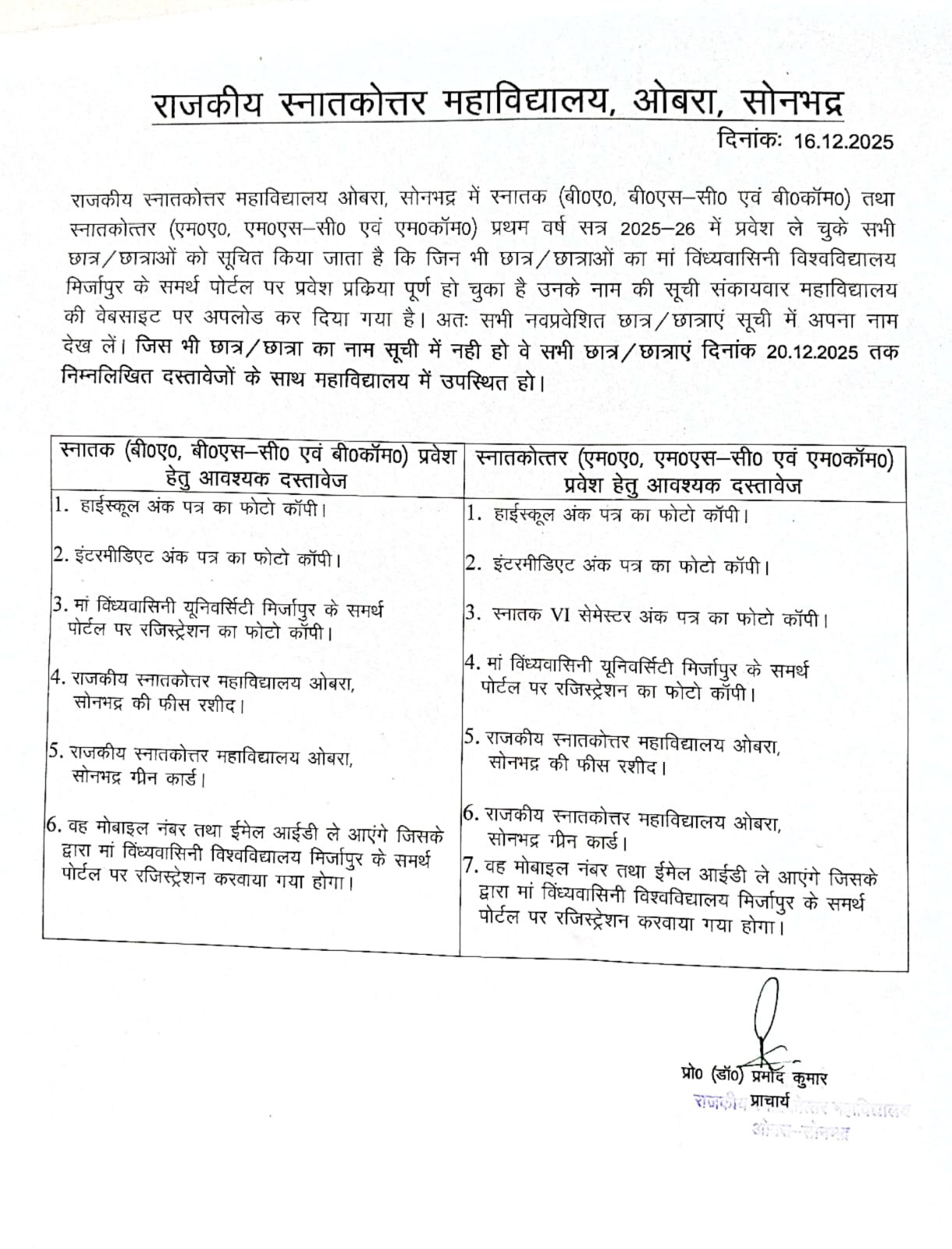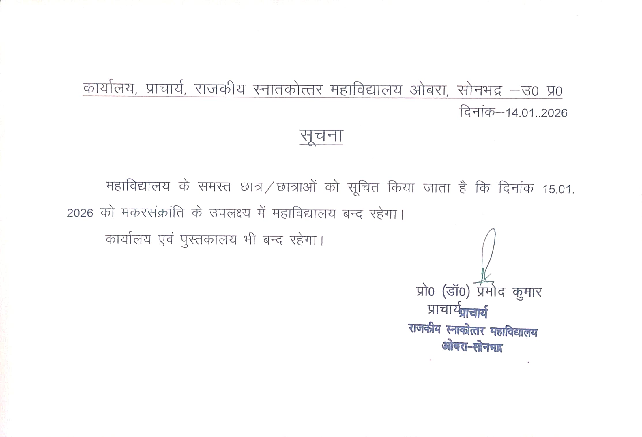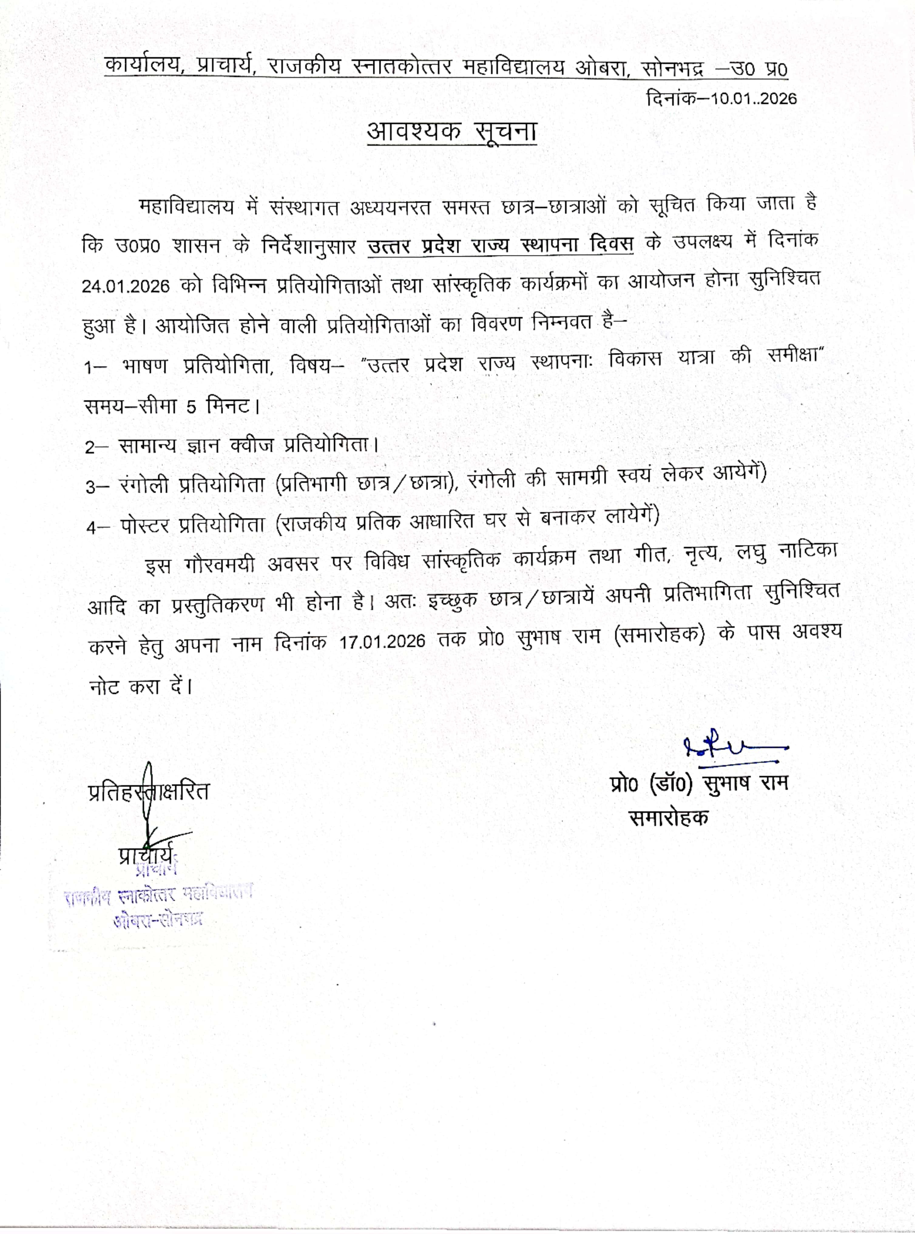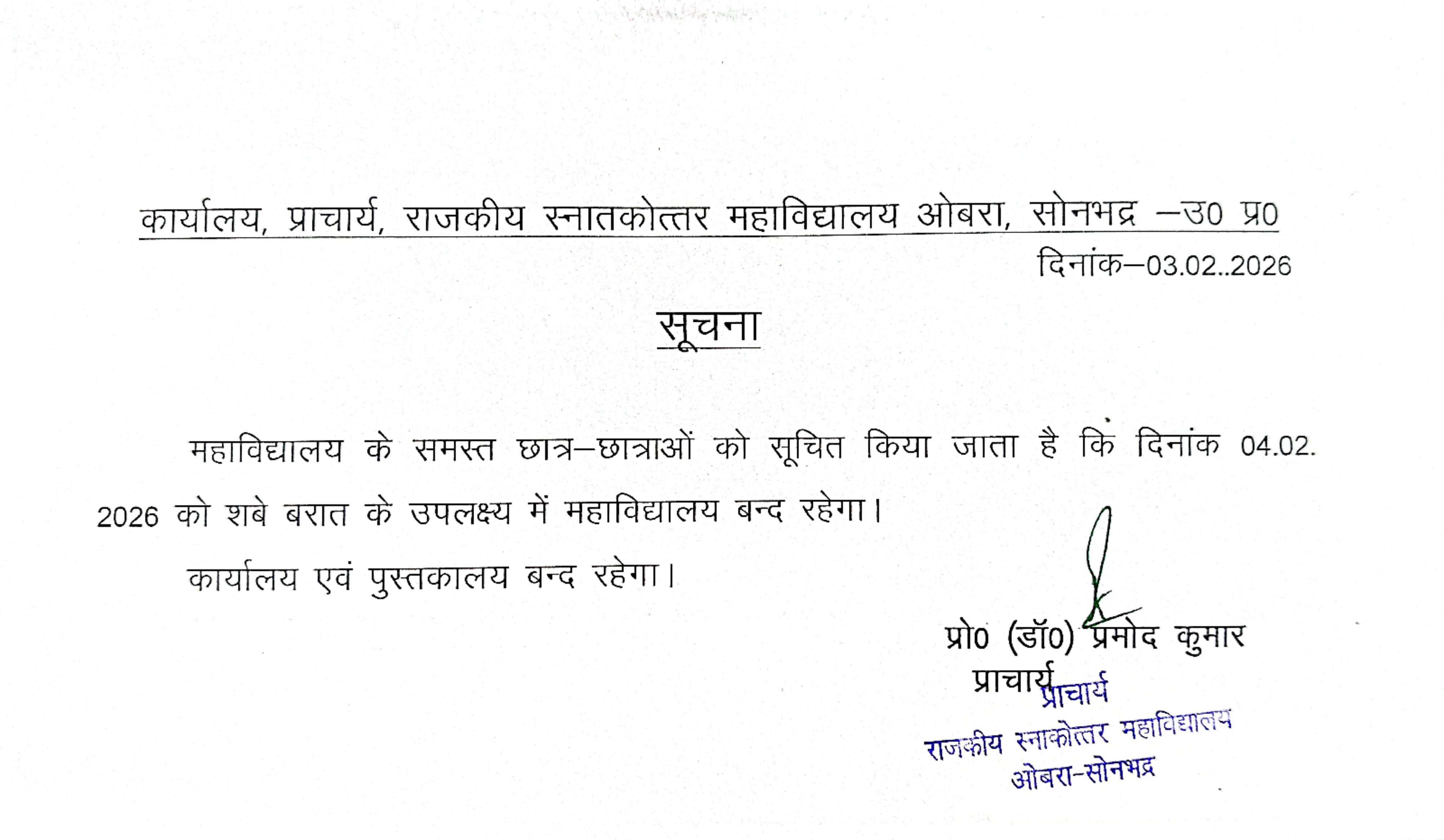 I welcome you at website of Govt. P.G. College Obra Sonebhadra (UP). I am much delighted that you have preferred this College for your academic pursuit after completion of your course. Our mission is to develop this College as a catalyst of change and versatile growth to prepare the students to think critically and act responsibly in a rapidly changing global environment.