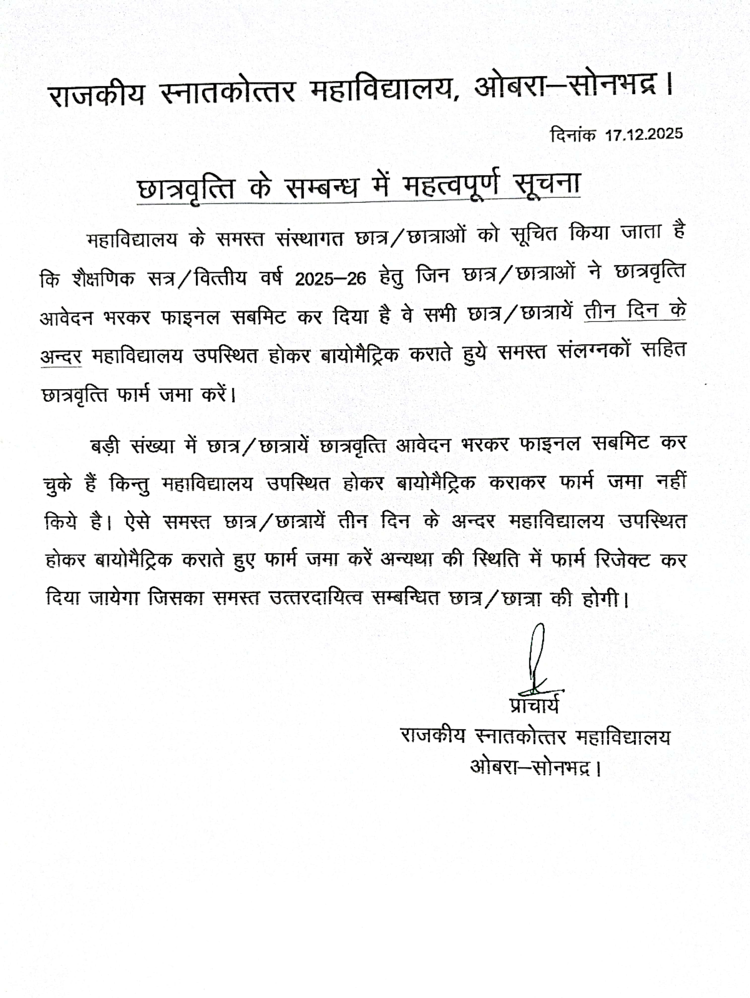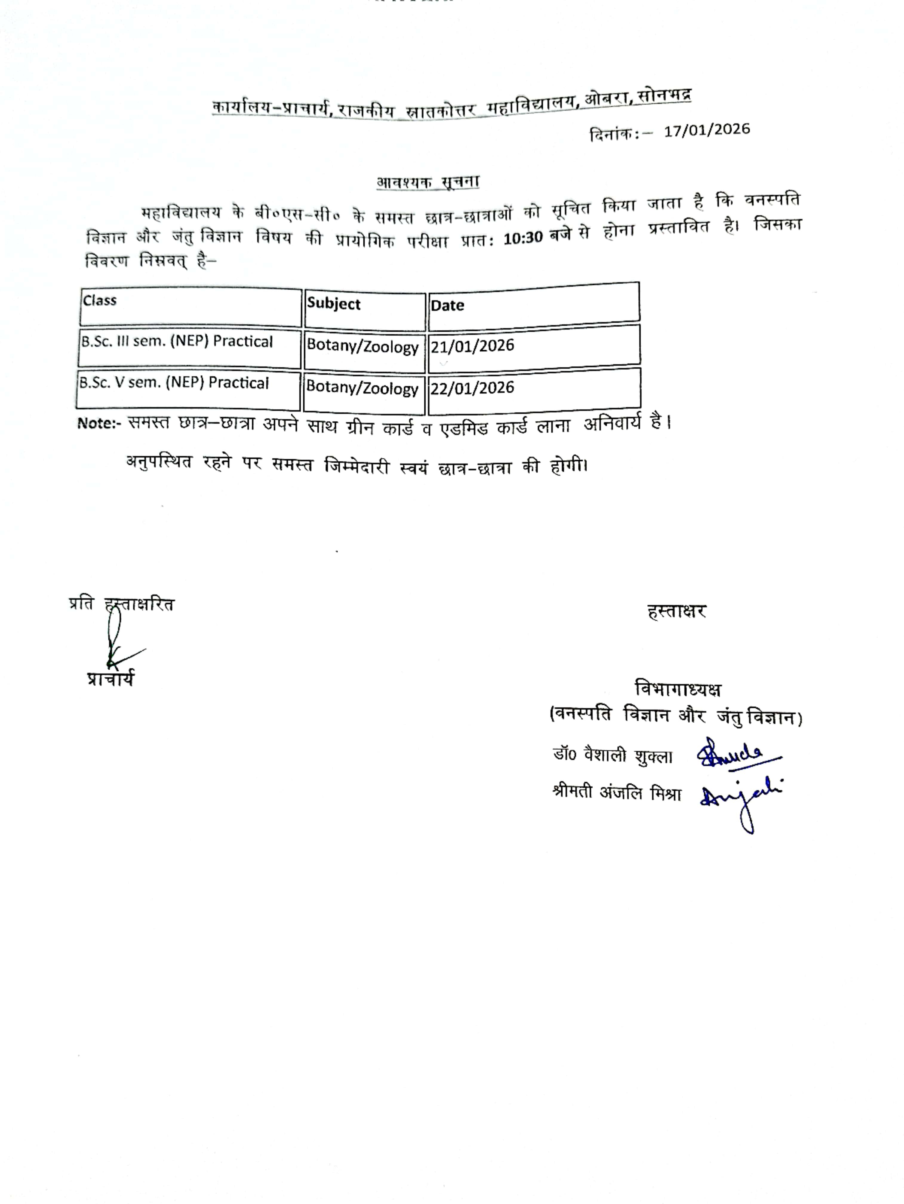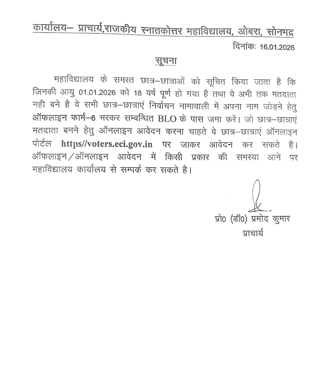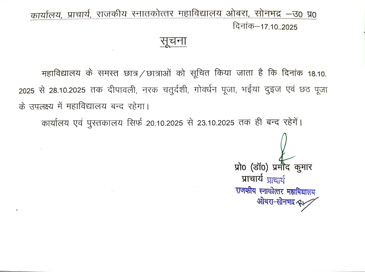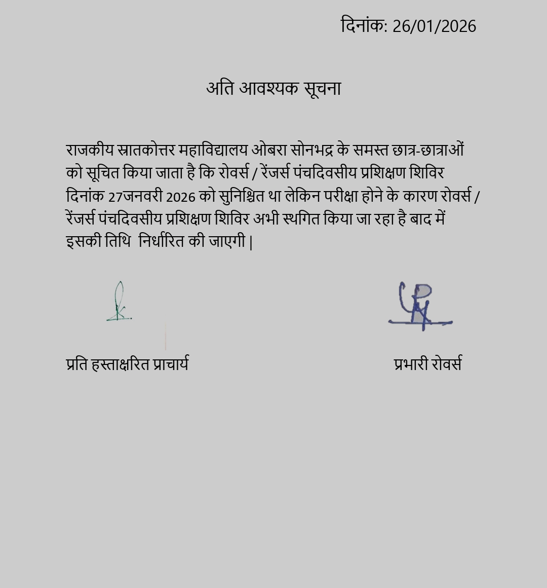 I welcome you at website of Govt. P.G. College Obra Sonebhadra (UP). I am much delighted that you have preferred this College for your academic pursuit after completion of your course. Our mission is to develop this College as a catalyst of change and versatile growth to prepare the students to think critically and act responsibly in a rapidly changing global environment.