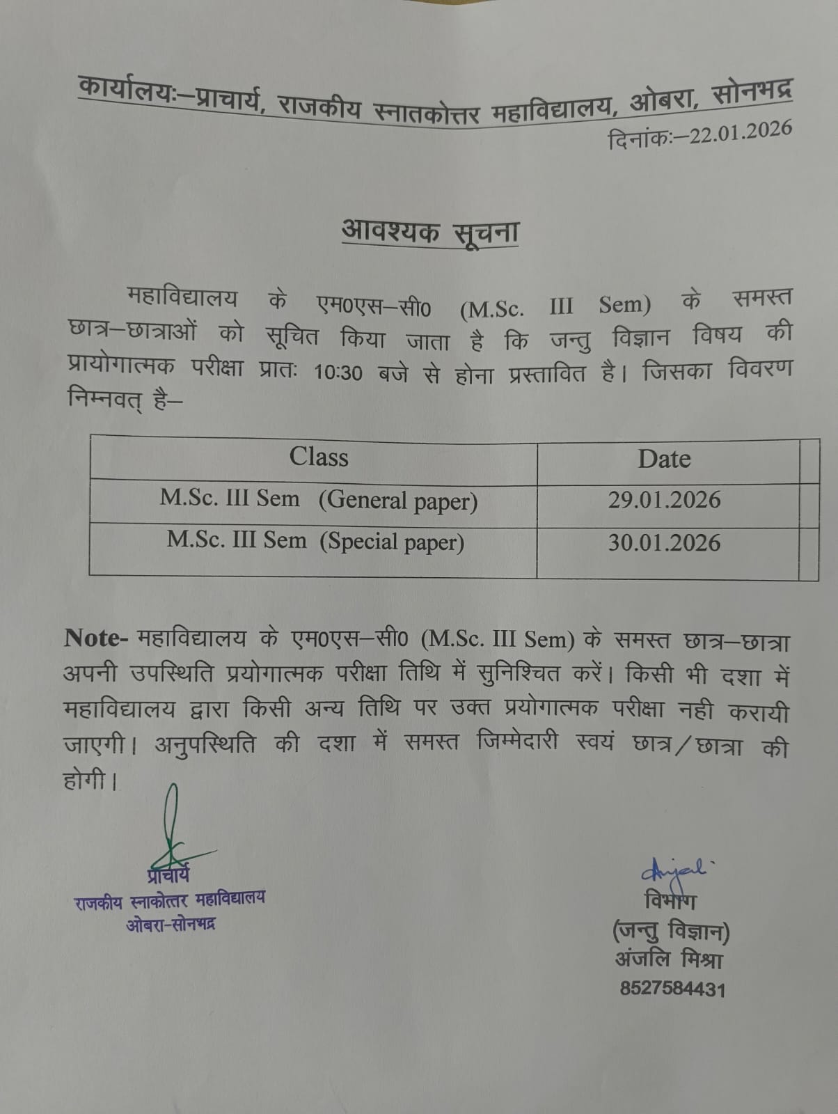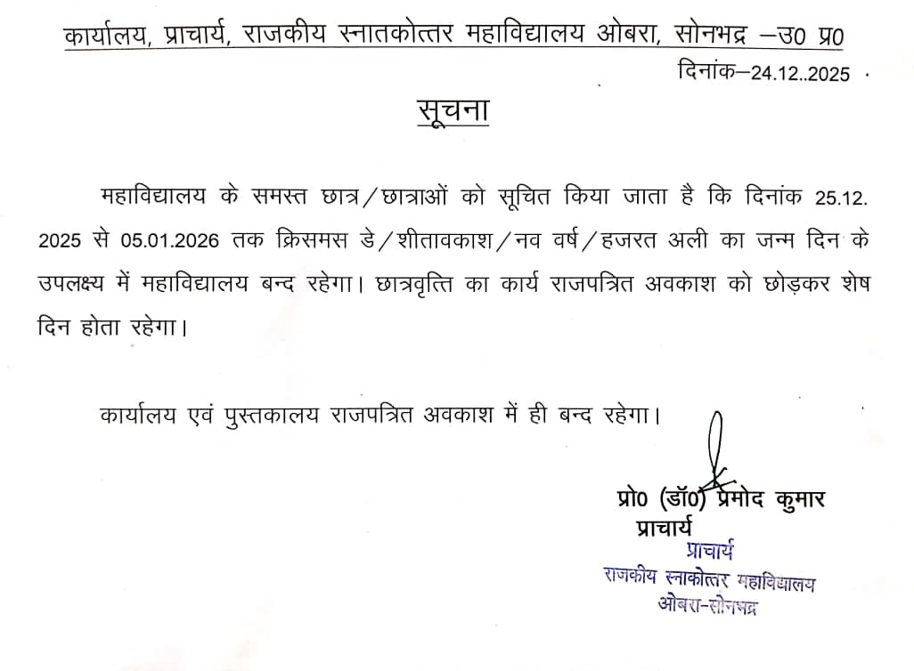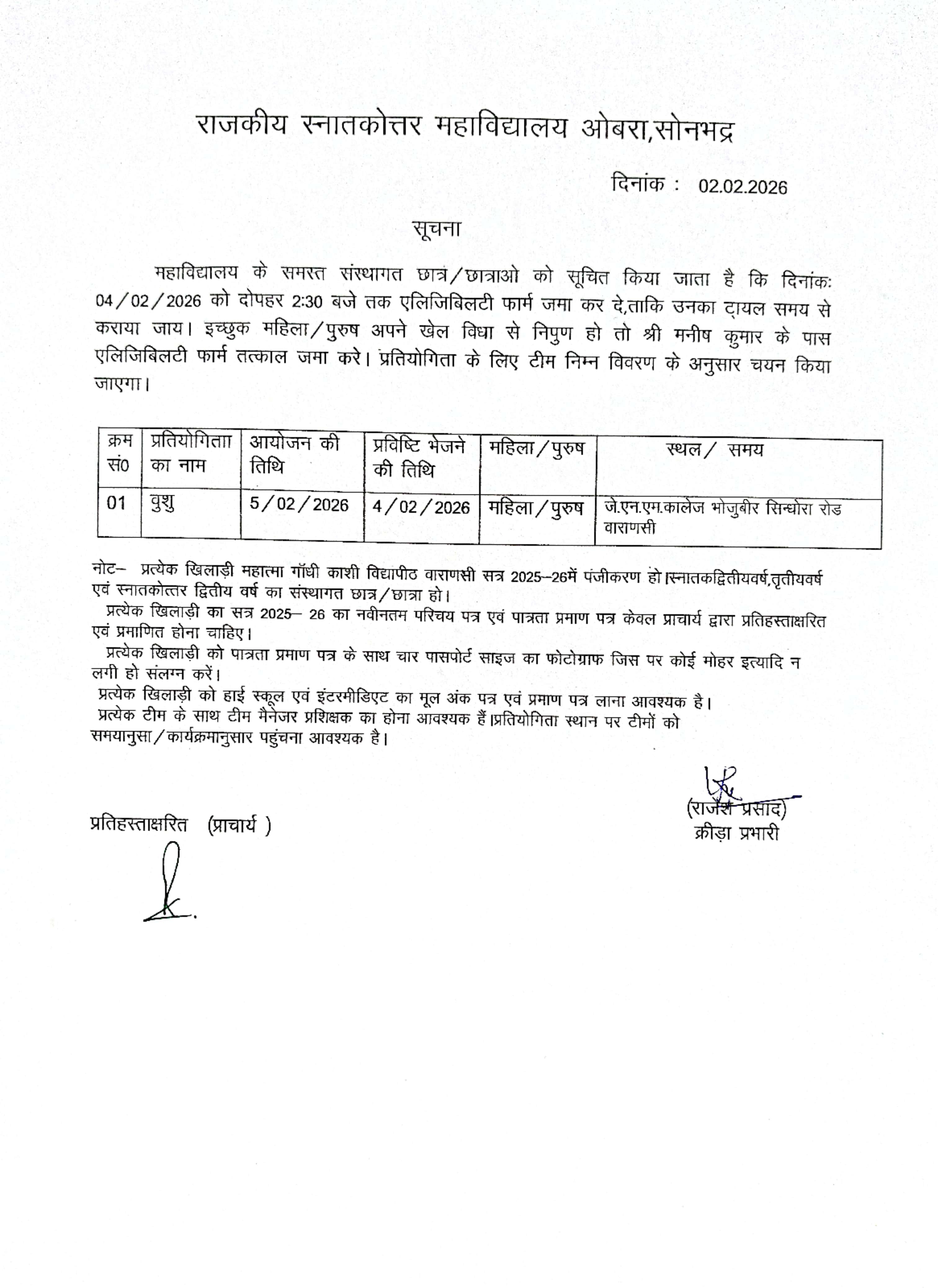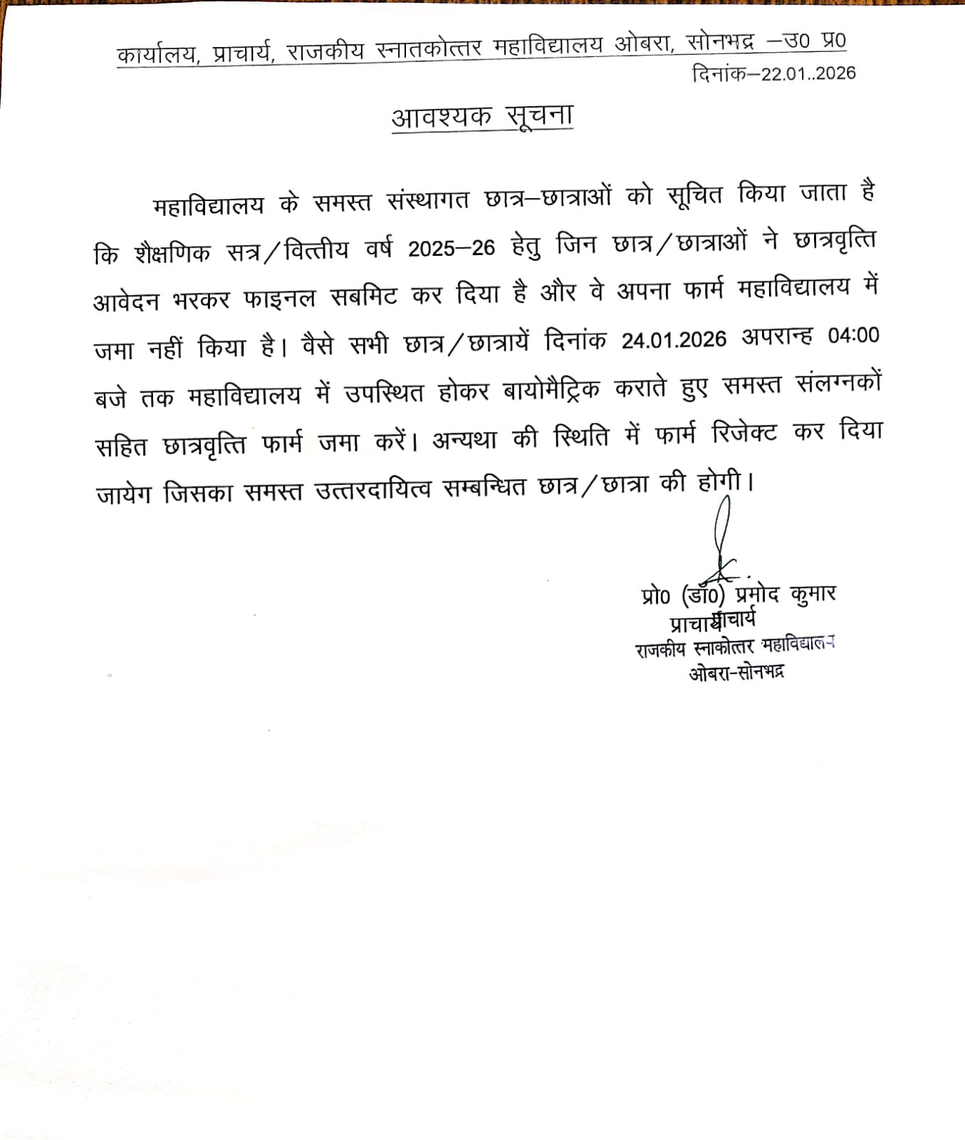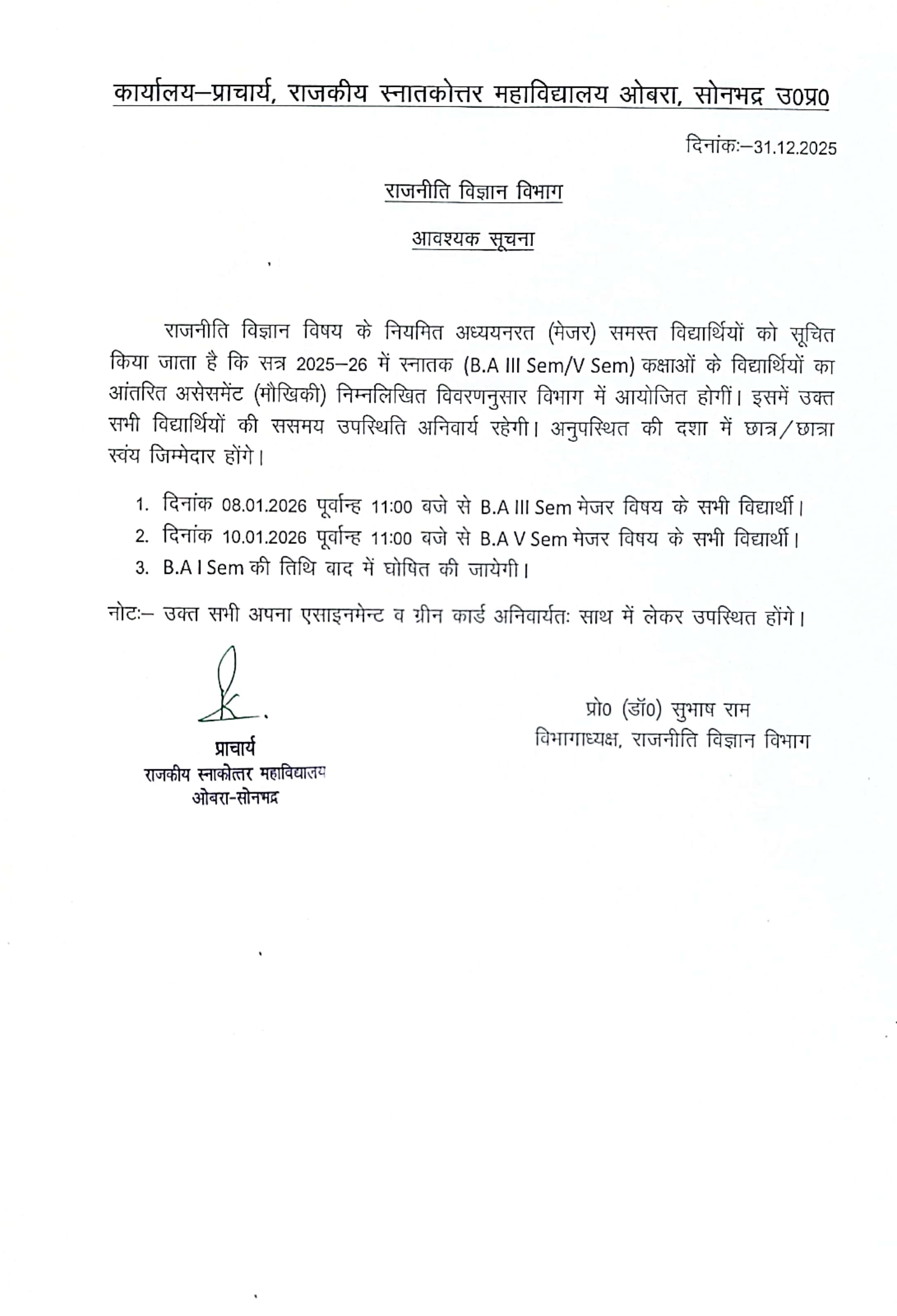 I welcome you at website of Govt. P.G. College Obra Sonebhadra (UP). I am much delighted that you have preferred this College for your academic pursuit after completion of your course. Our mission is to develop this College as a catalyst of change and versatile growth to prepare the students to think critically and act responsibly in a rapidly changing global environment.