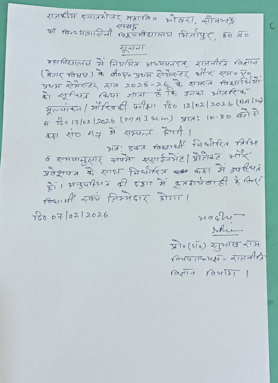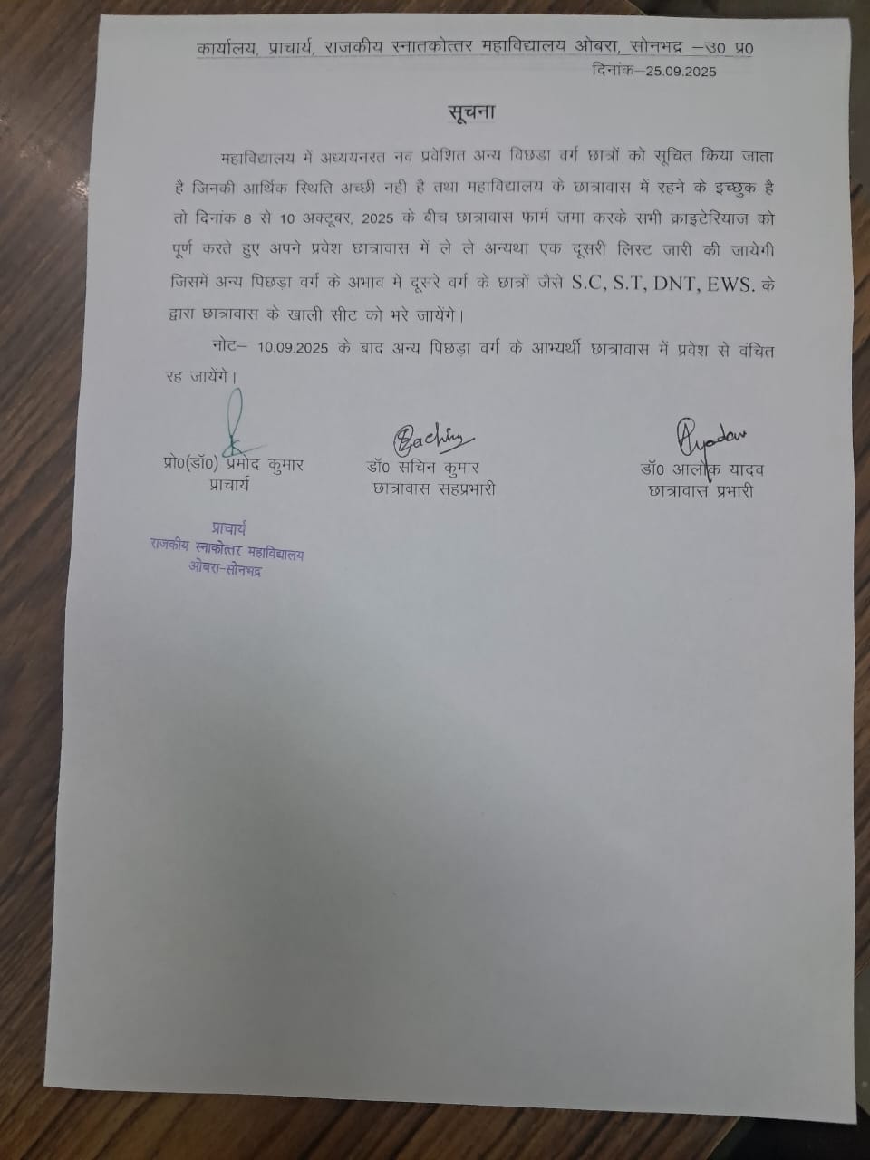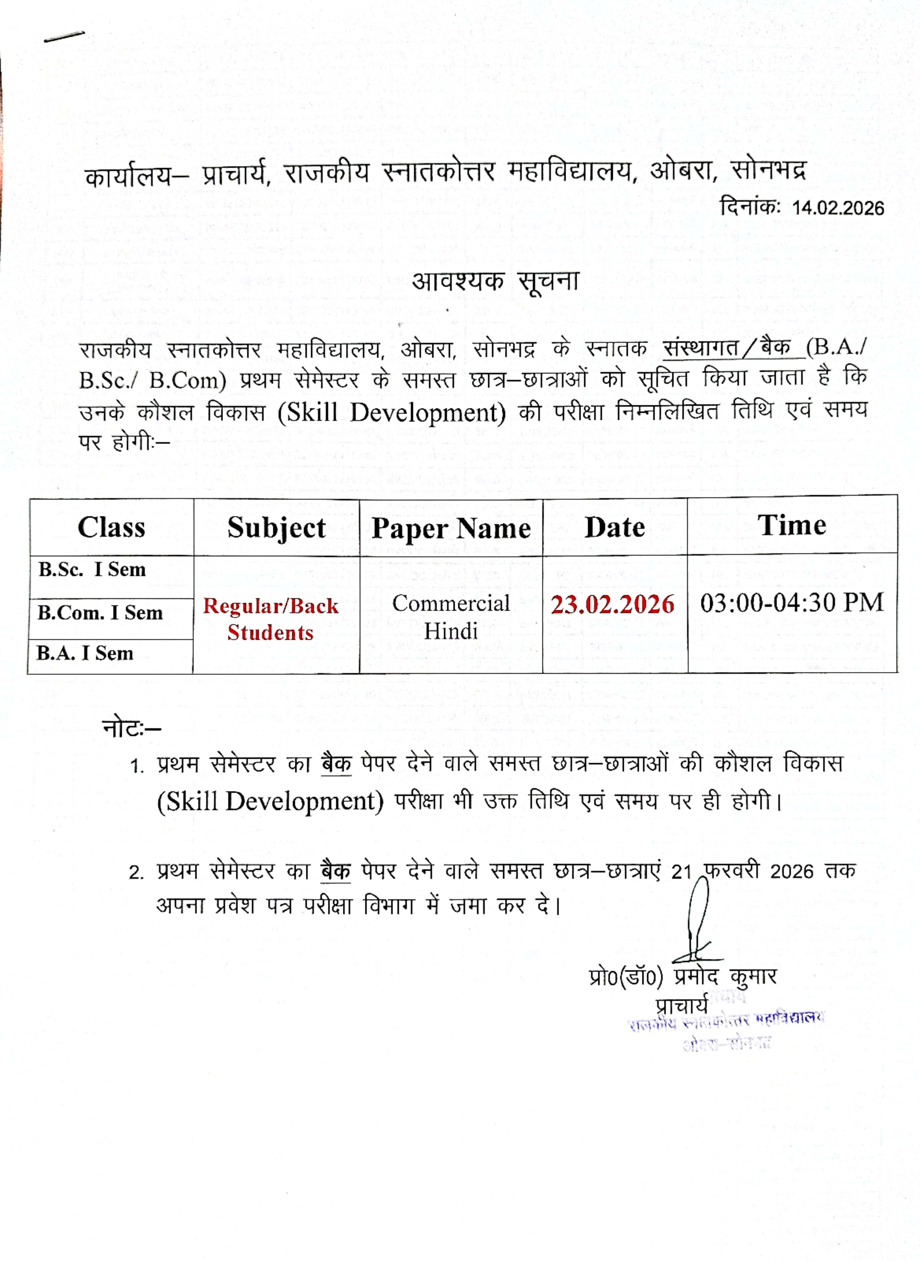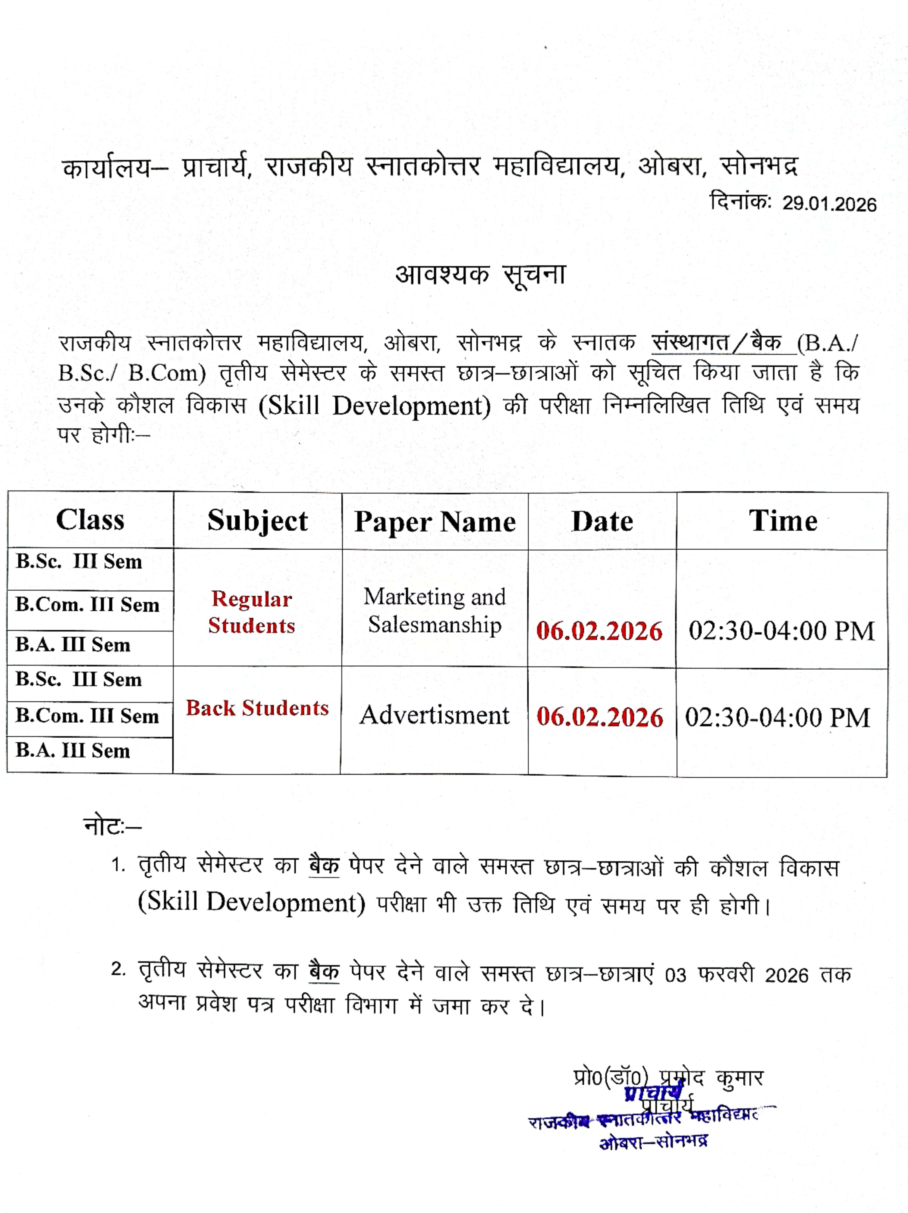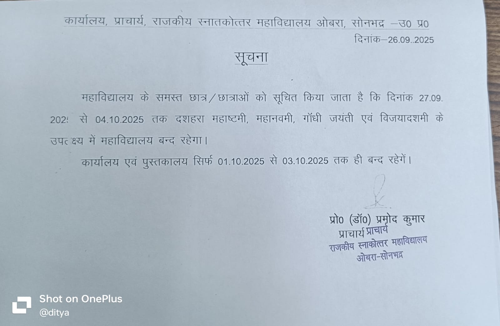 I welcome you at website of Govt. P.G. College Obra Sonebhadra (UP). I am much delighted that you have preferred this College for your academic pursuit after completion of your course. Our mission is to develop this College as a catalyst of change and versatile growth to prepare the students to think critically and act responsibly in a rapidly changing global environment.