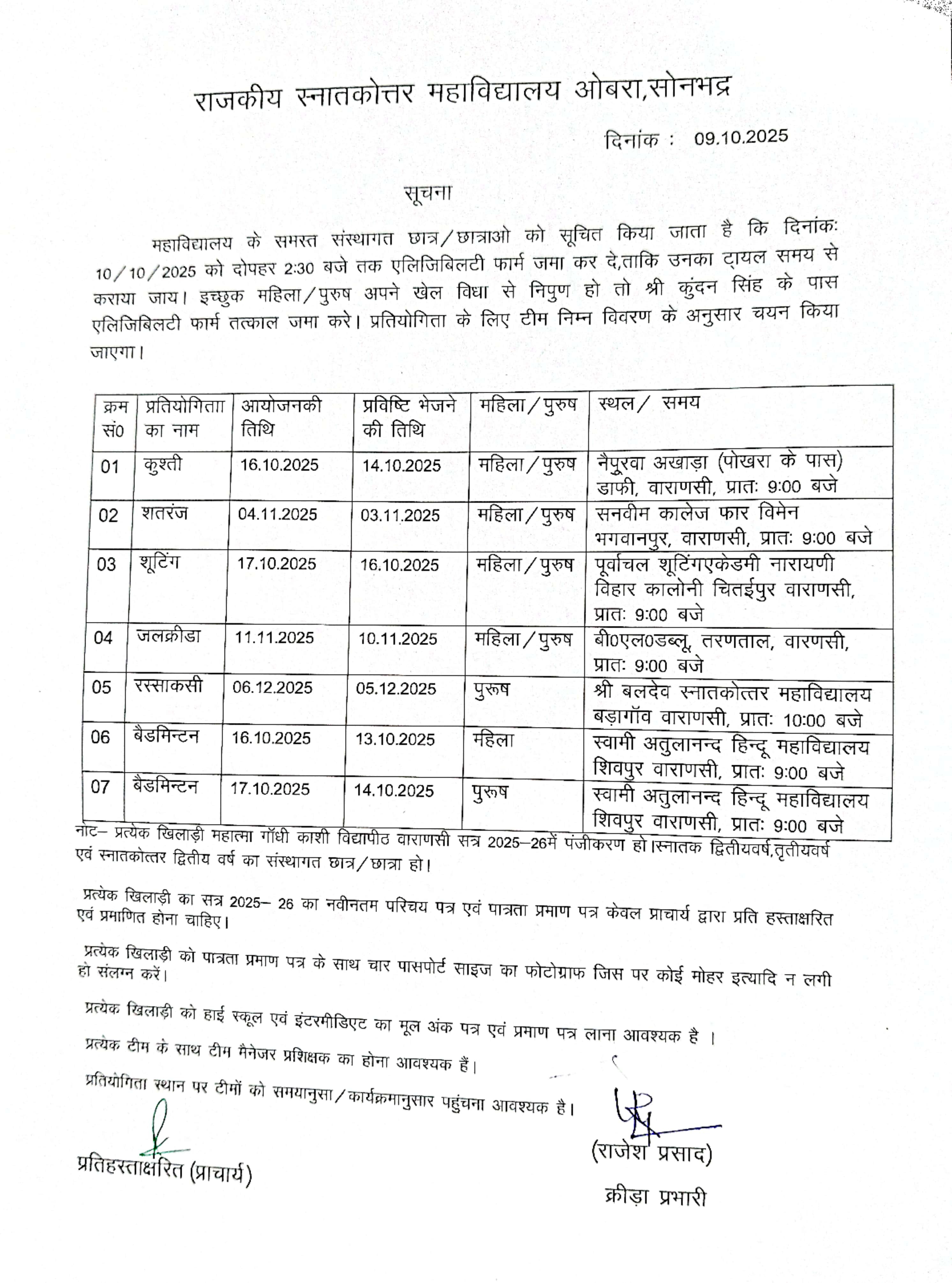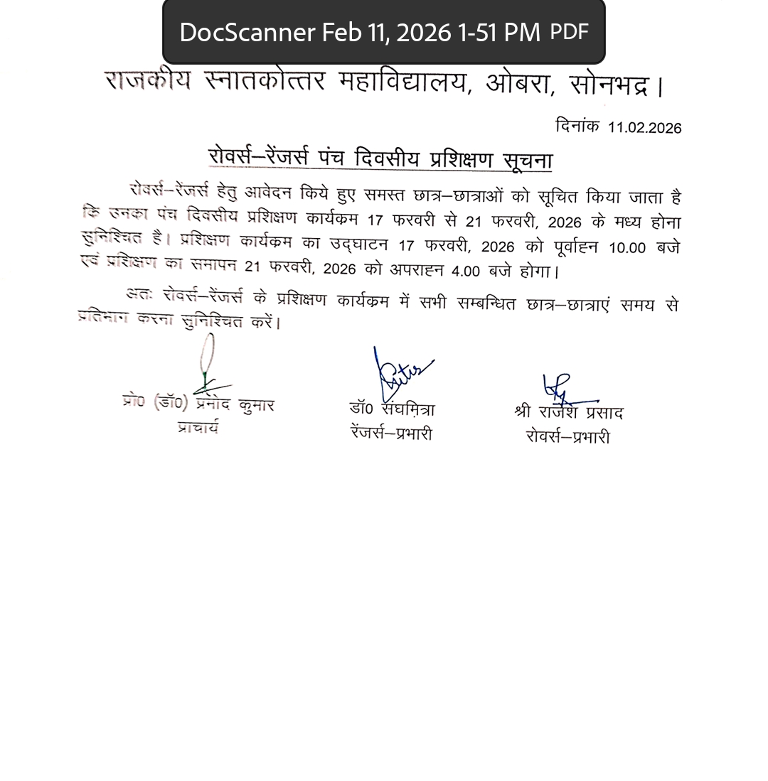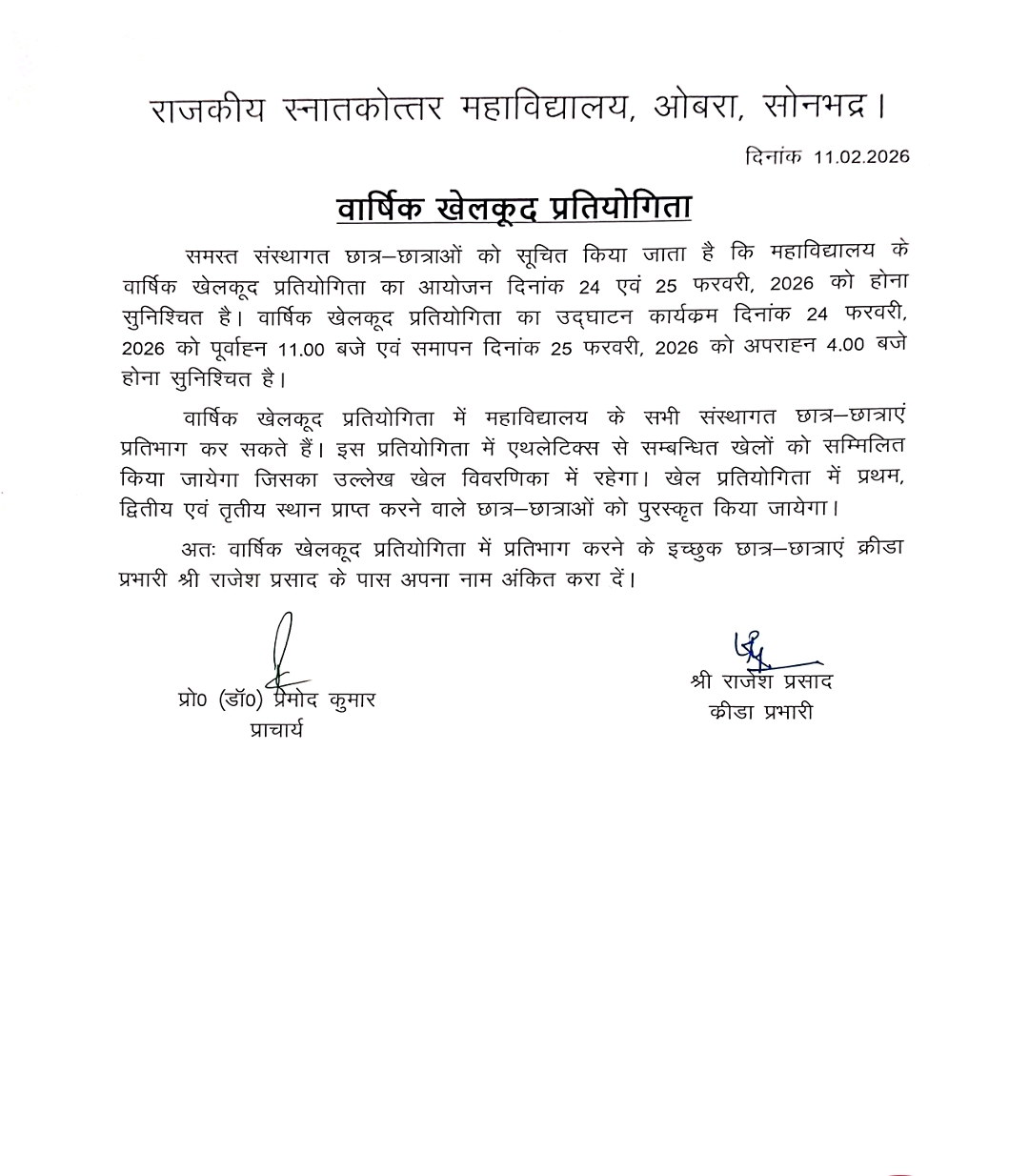 We, at Govt. P.G. College Obra Sonebhadra (UP), have highly qualified, dedicated and committed faculty who are ever ready to guide students, sharpen their skills and develop their personality. The College library has over 45000 books in different disciplines to provide intellectually stimulating resource material and a very conducive and calm environment to enhance the learning abilities. The Cultural, academic and sports councils of this college organize vibrant, scholastically thoughtful, and exciting events to enhance the extra-curricular activities of the students.