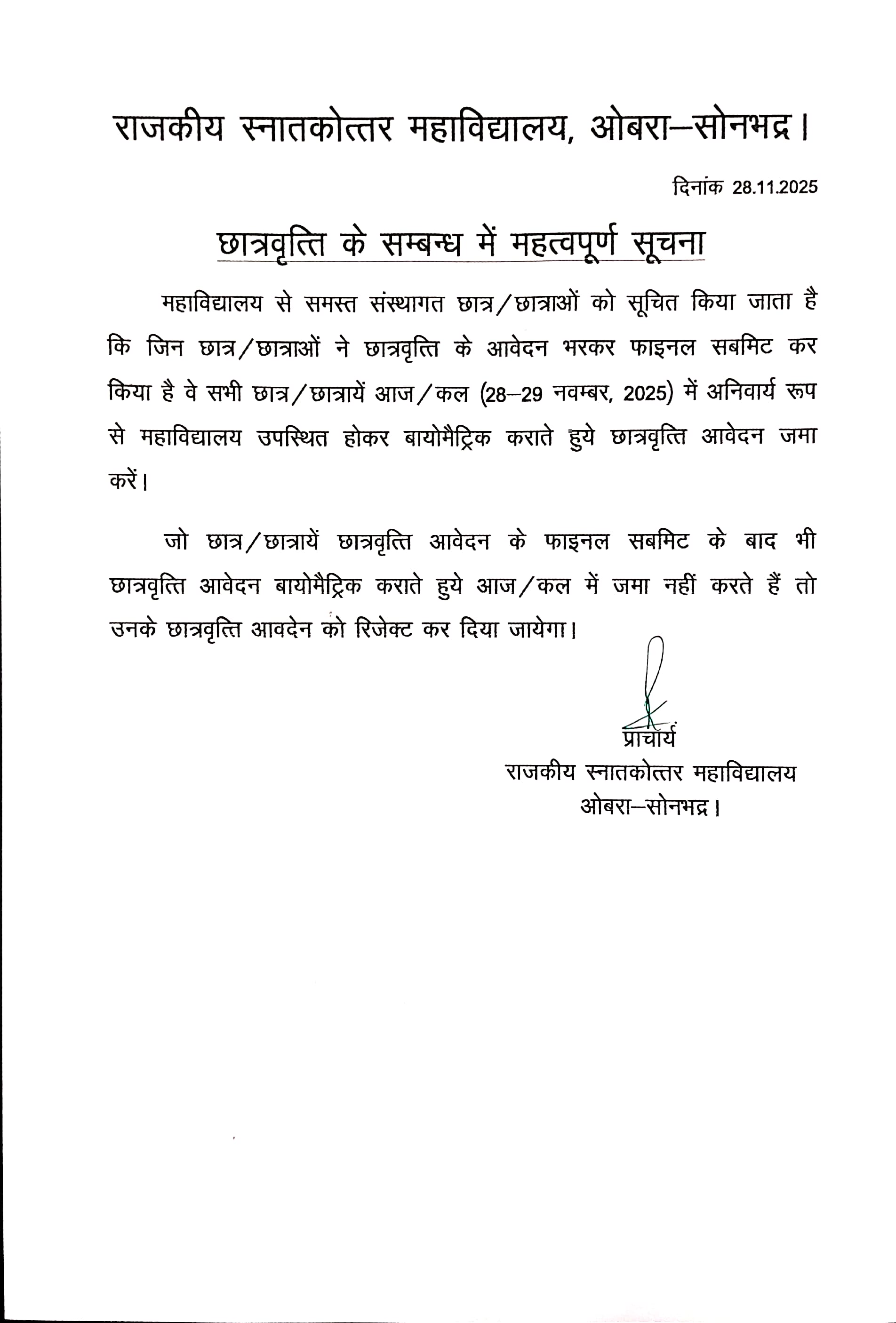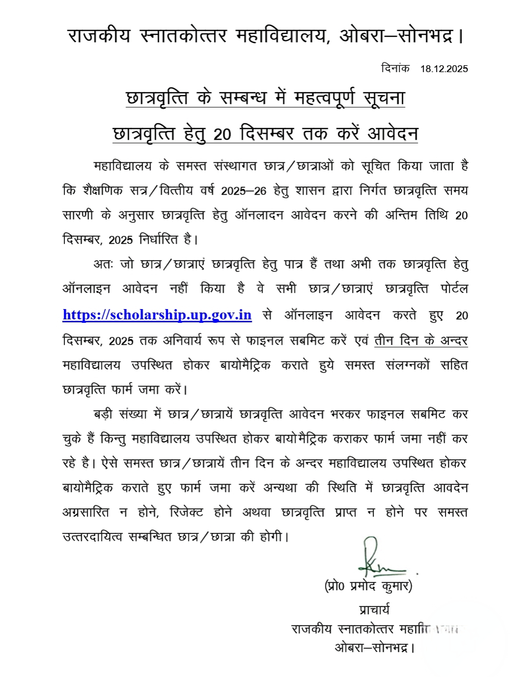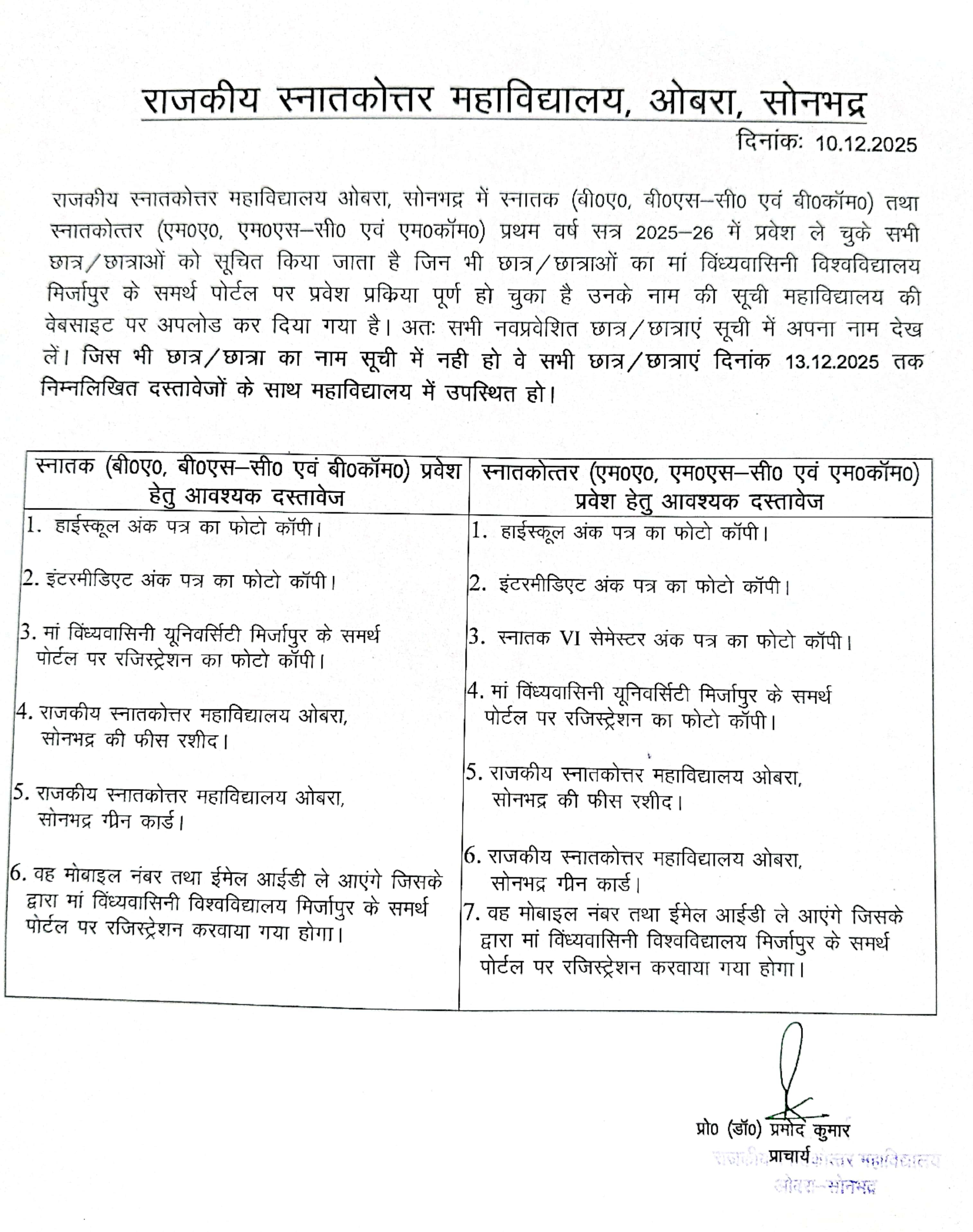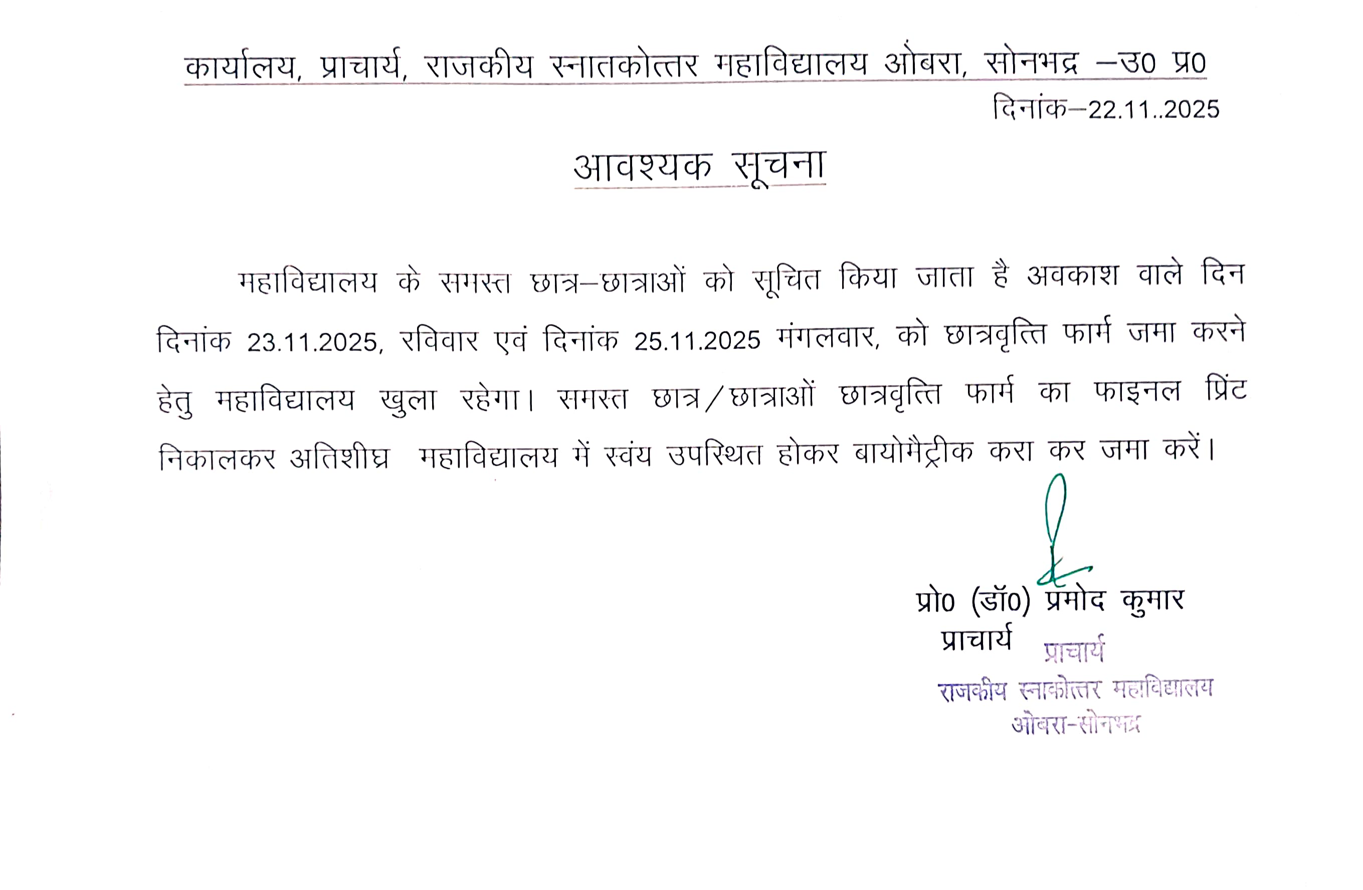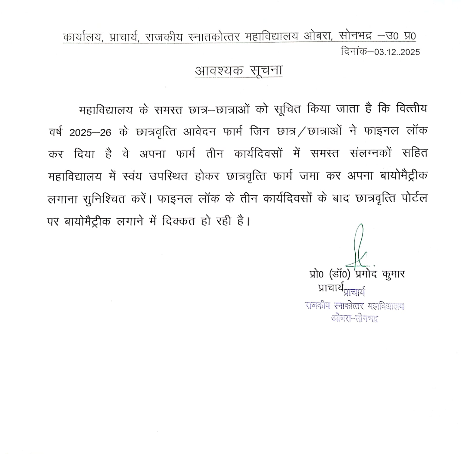 I welcome you at website of Govt. P.G. College Obra Sonebhadra (UP). I am much delighted that you have preferred this College for your academic pursuit after completion of your course. Our mission is to develop this College as a catalyst of change and versatile growth to prepare the students to think critically and act responsibly in a rapidly changing global environment.