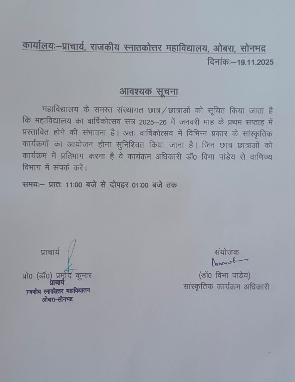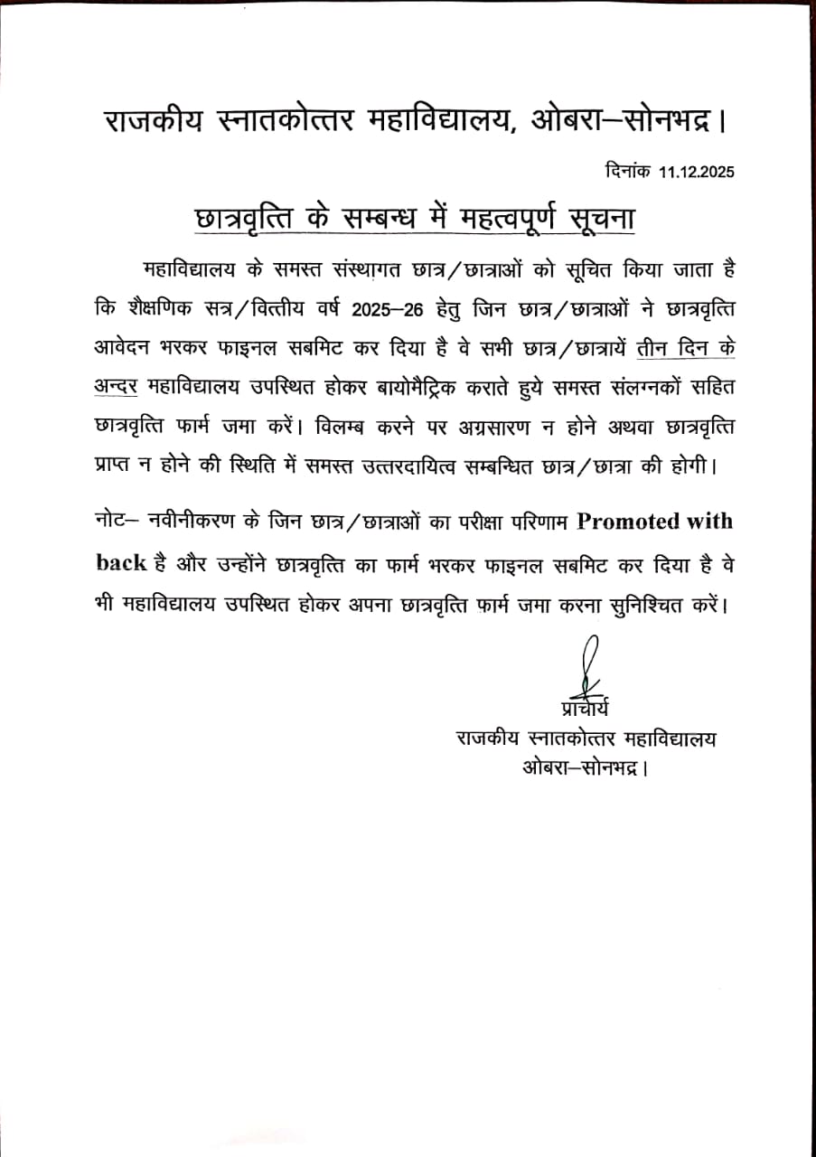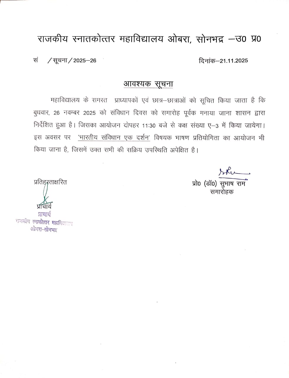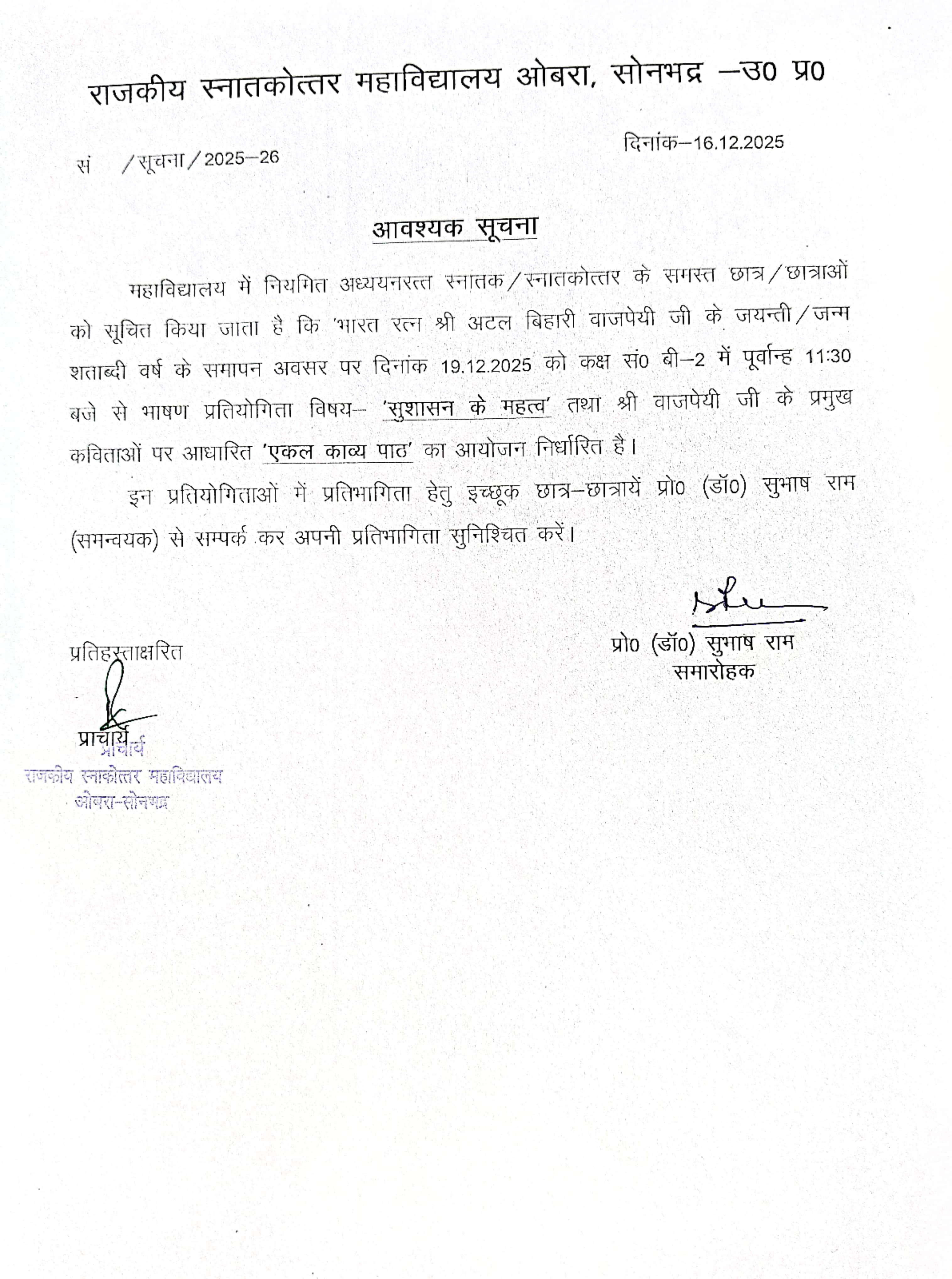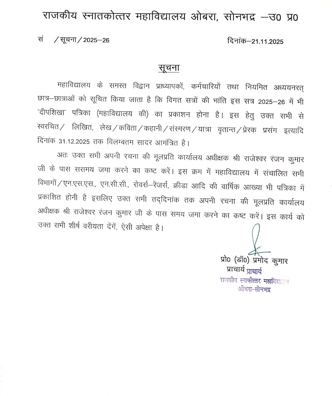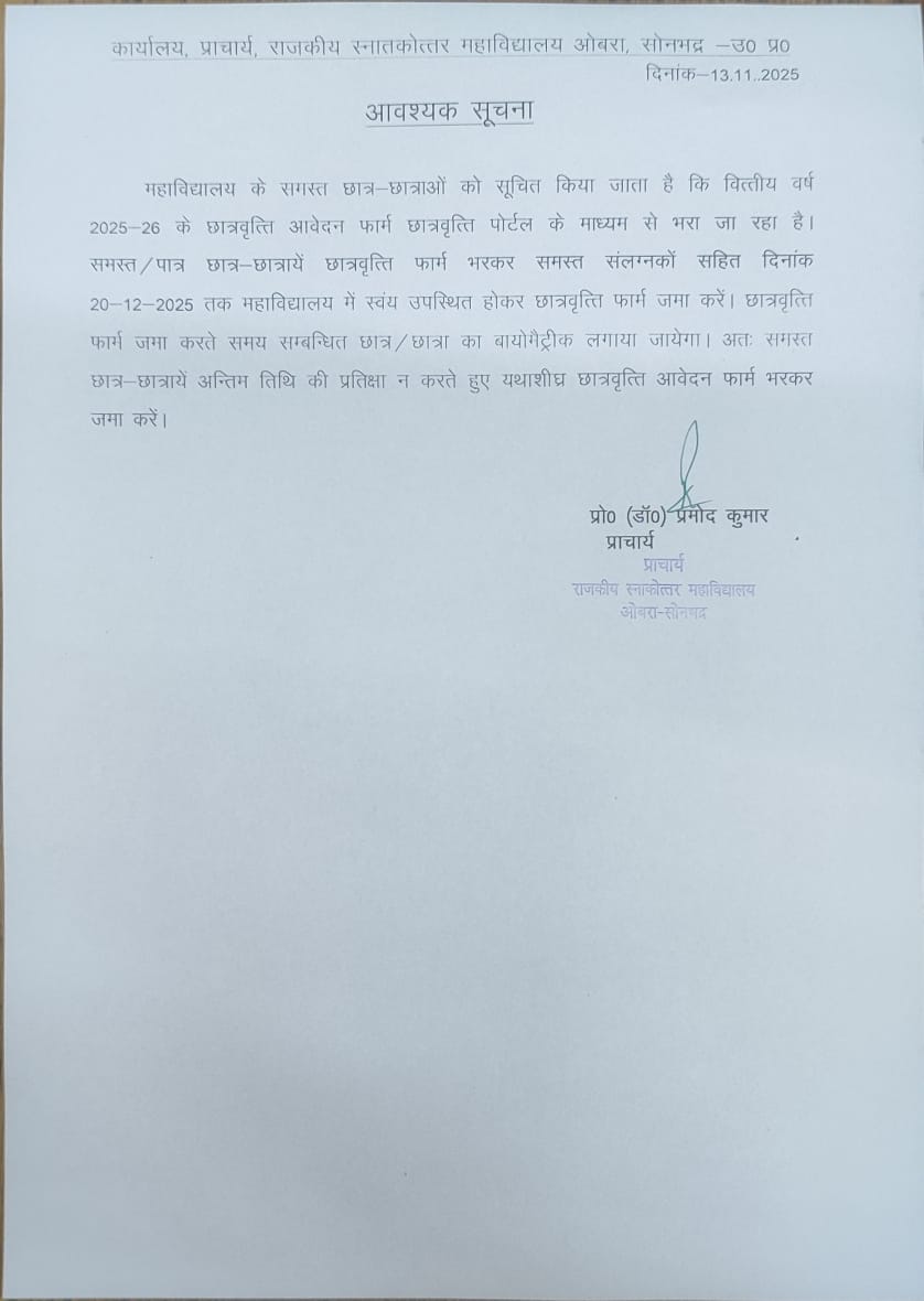 I welcome you at website of Govt. P.G. College Obra Sonebhadra (UP). I am much delighted that you have preferred this College for your academic pursuit after completion of your course. Our mission is to develop this College as a catalyst of change and versatile growth to prepare the students to think critically and act responsibly in a rapidly changing global environment.