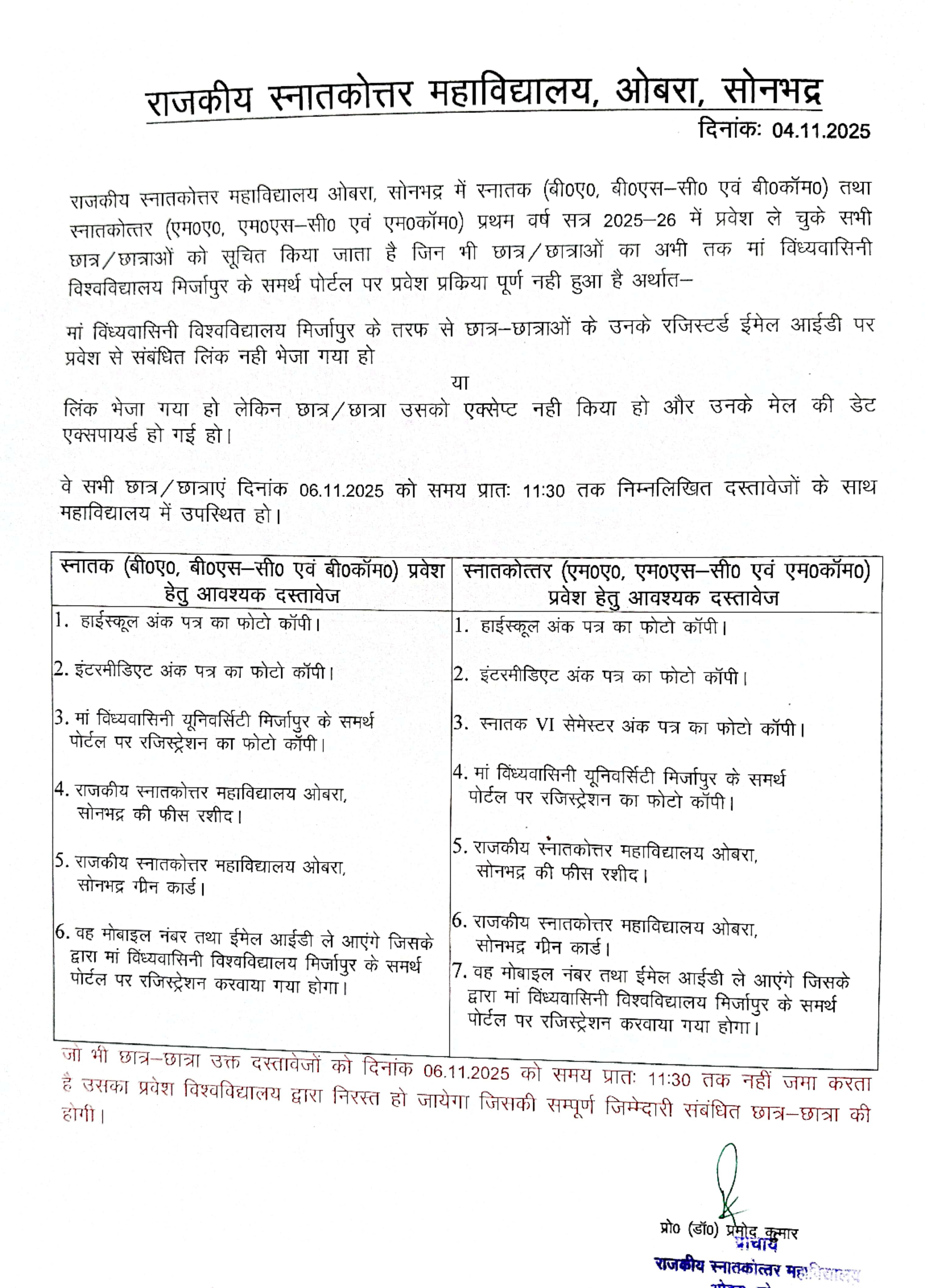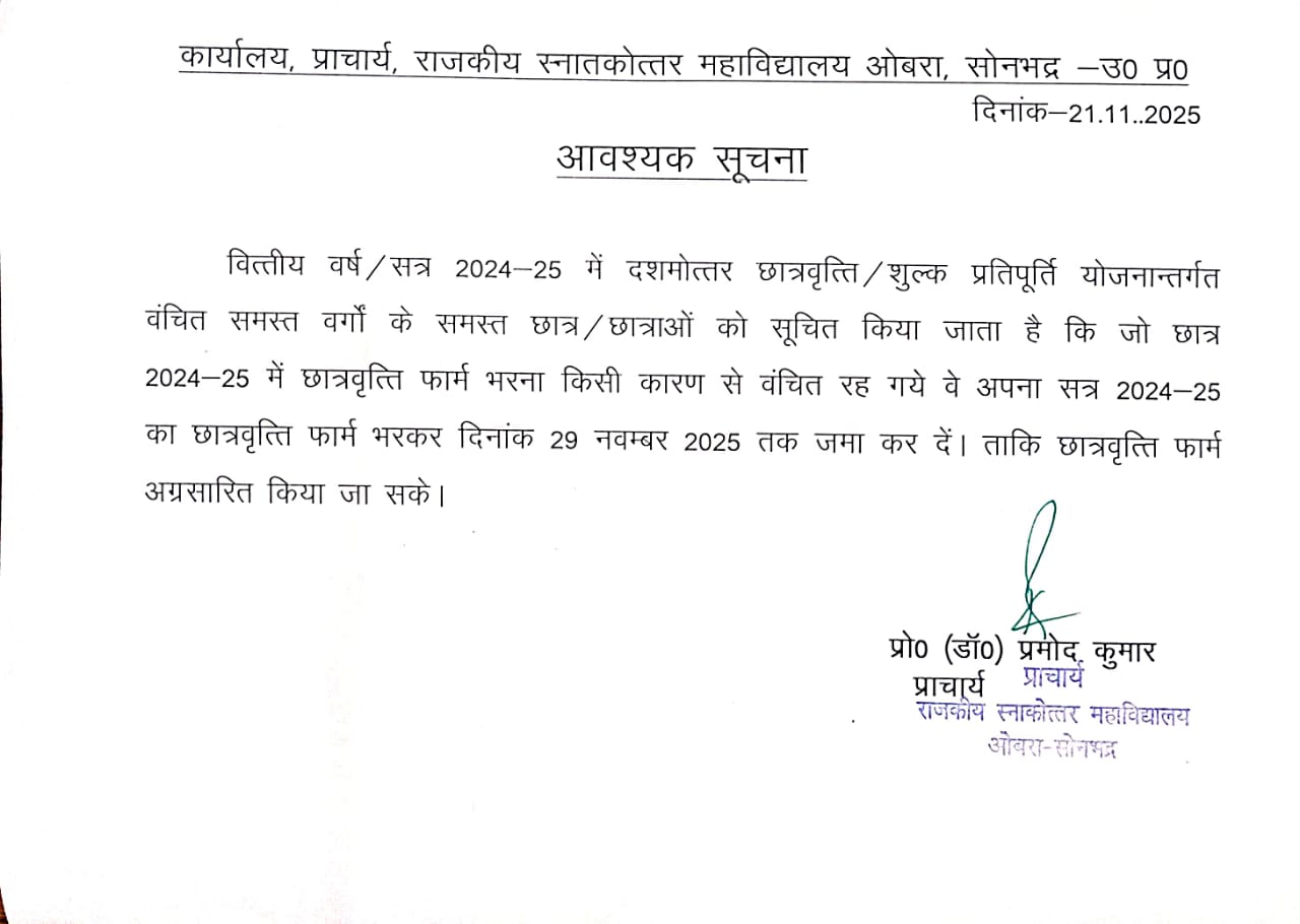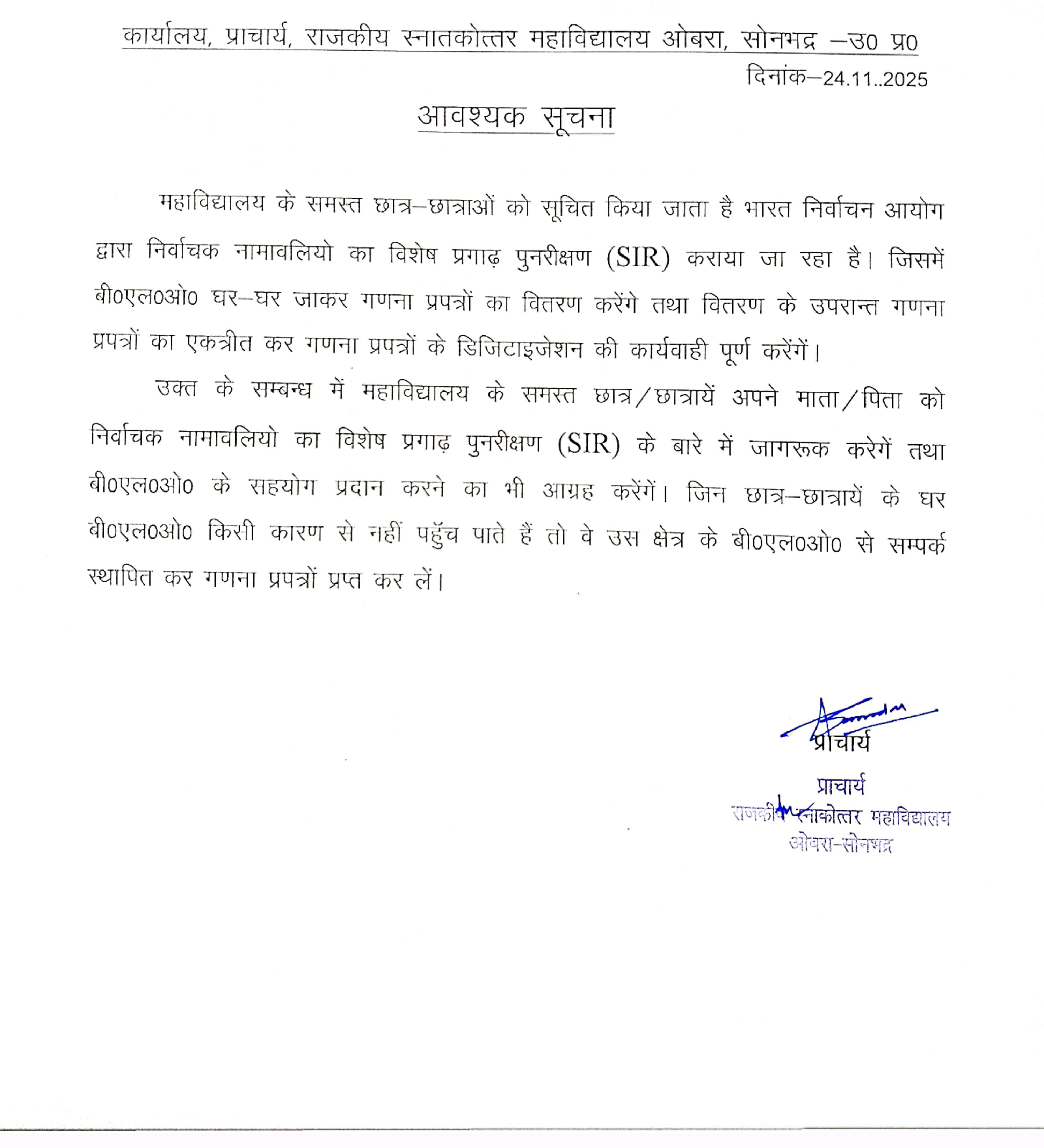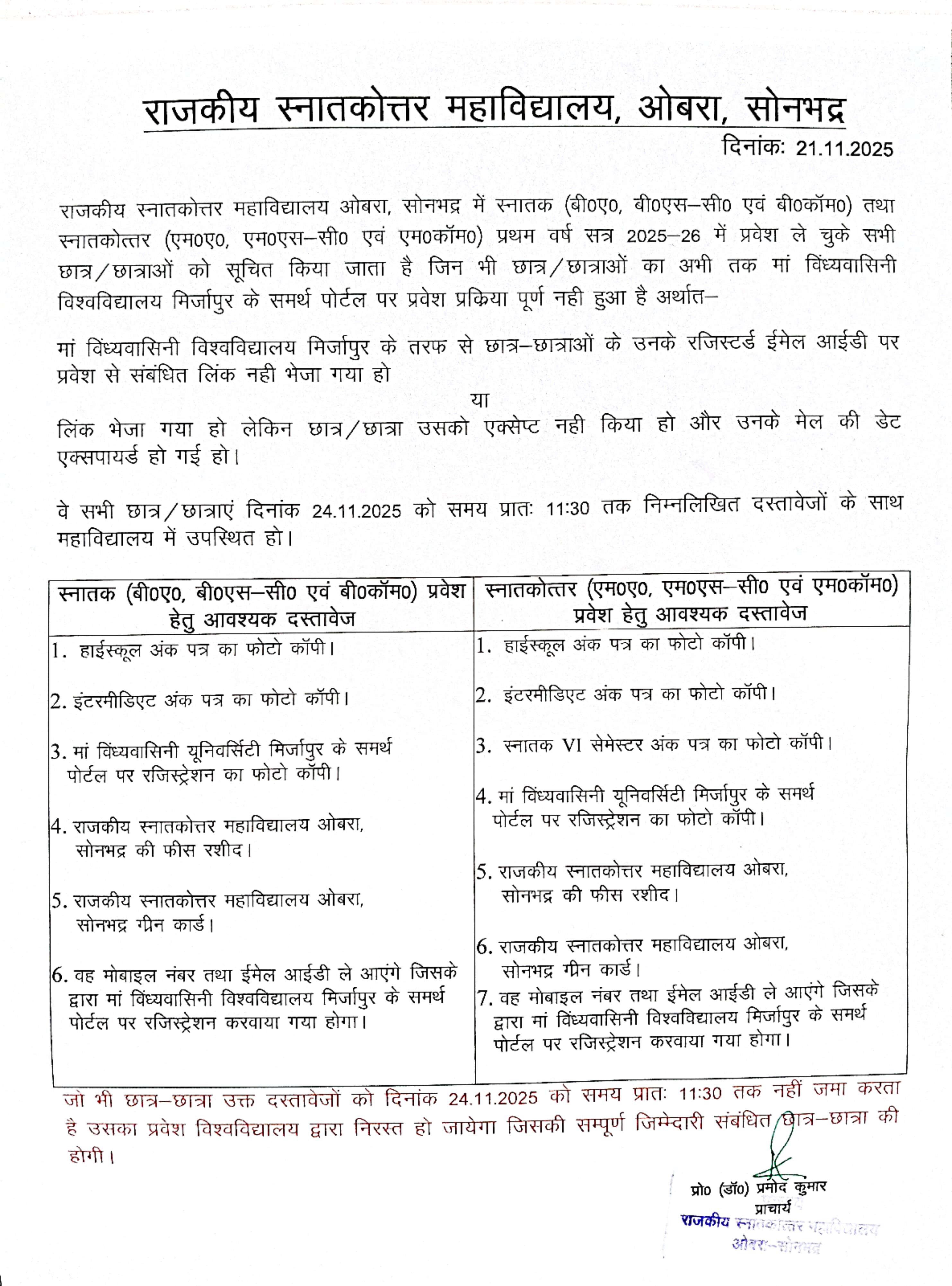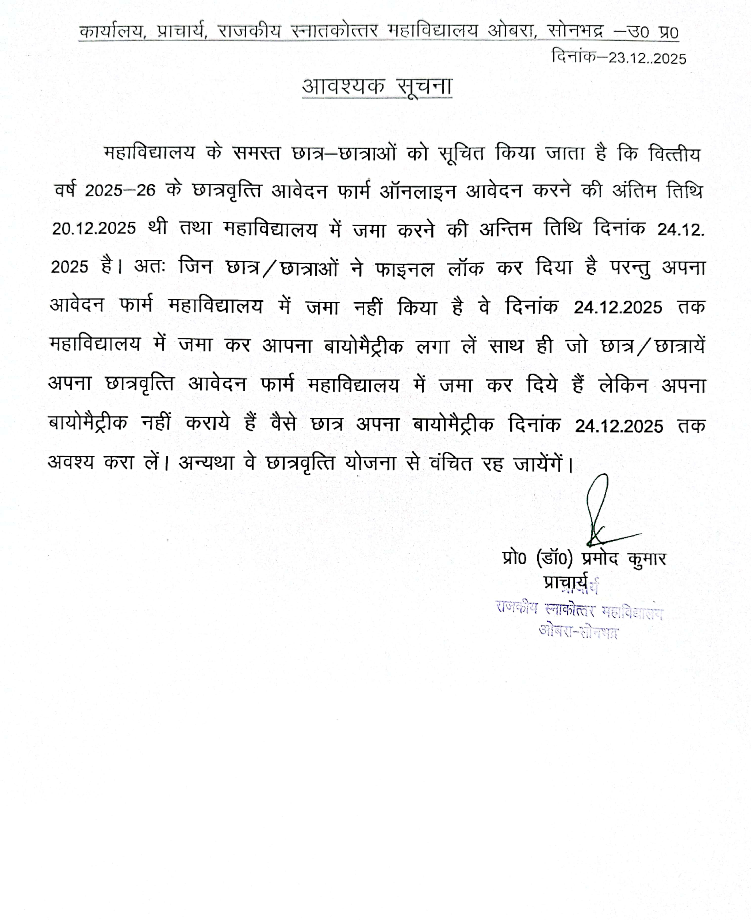 I welcome you at website of Govt. P.G. College Obra Sonebhadra (UP). I am much delighted that you have preferred this College for your academic pursuit after completion of your course. Our mission is to develop this College as a catalyst of change and versatile growth to prepare the students to think critically and act responsibly in a rapidly changing global environment.