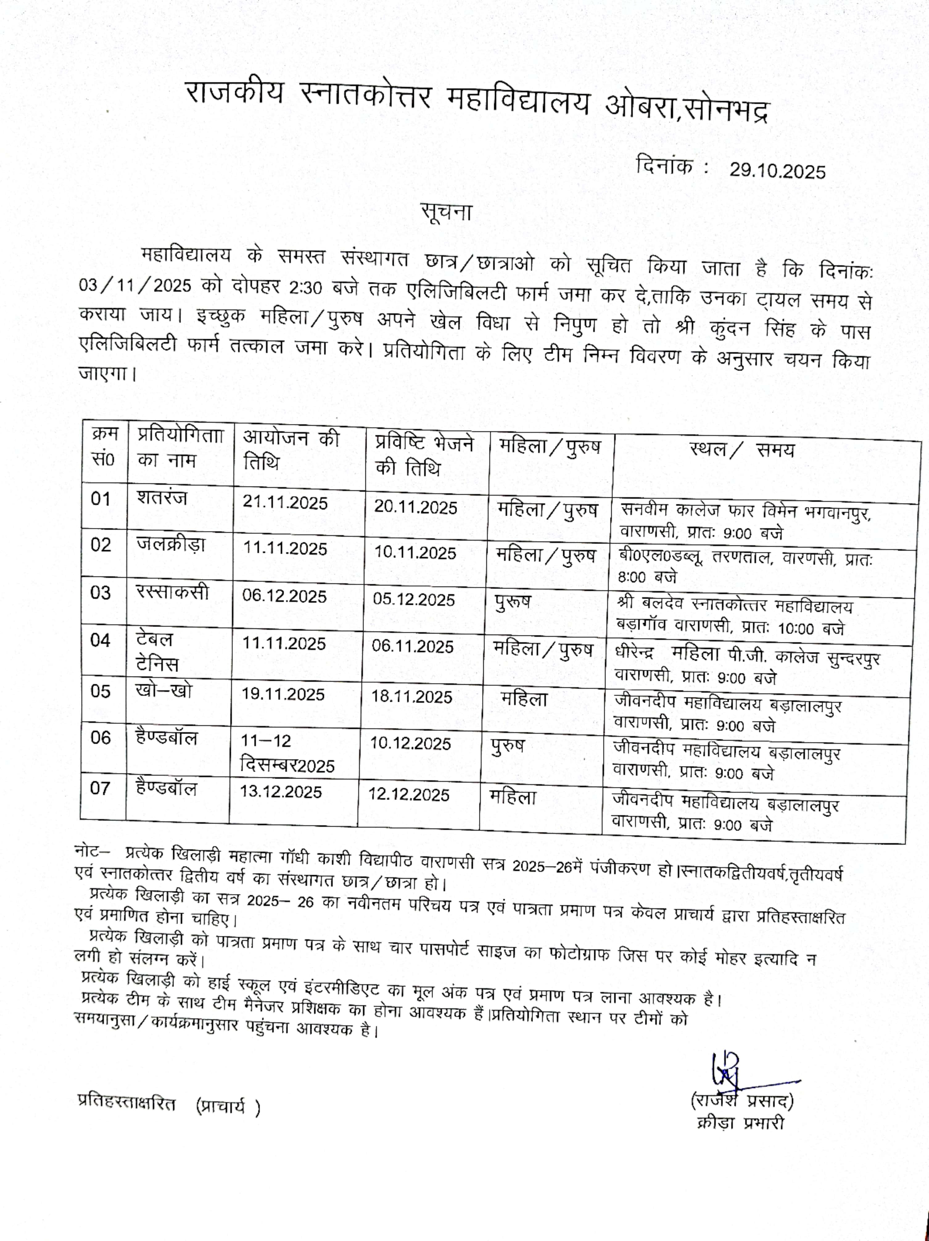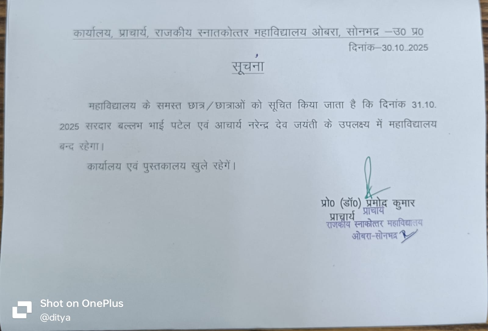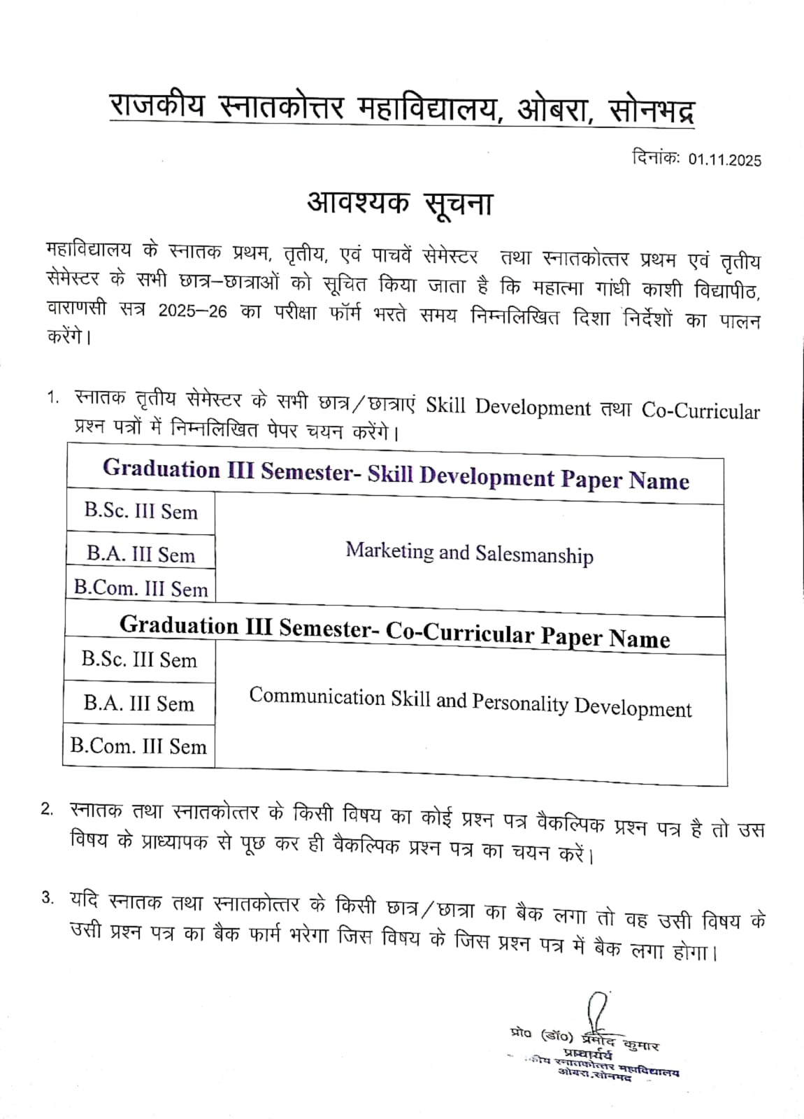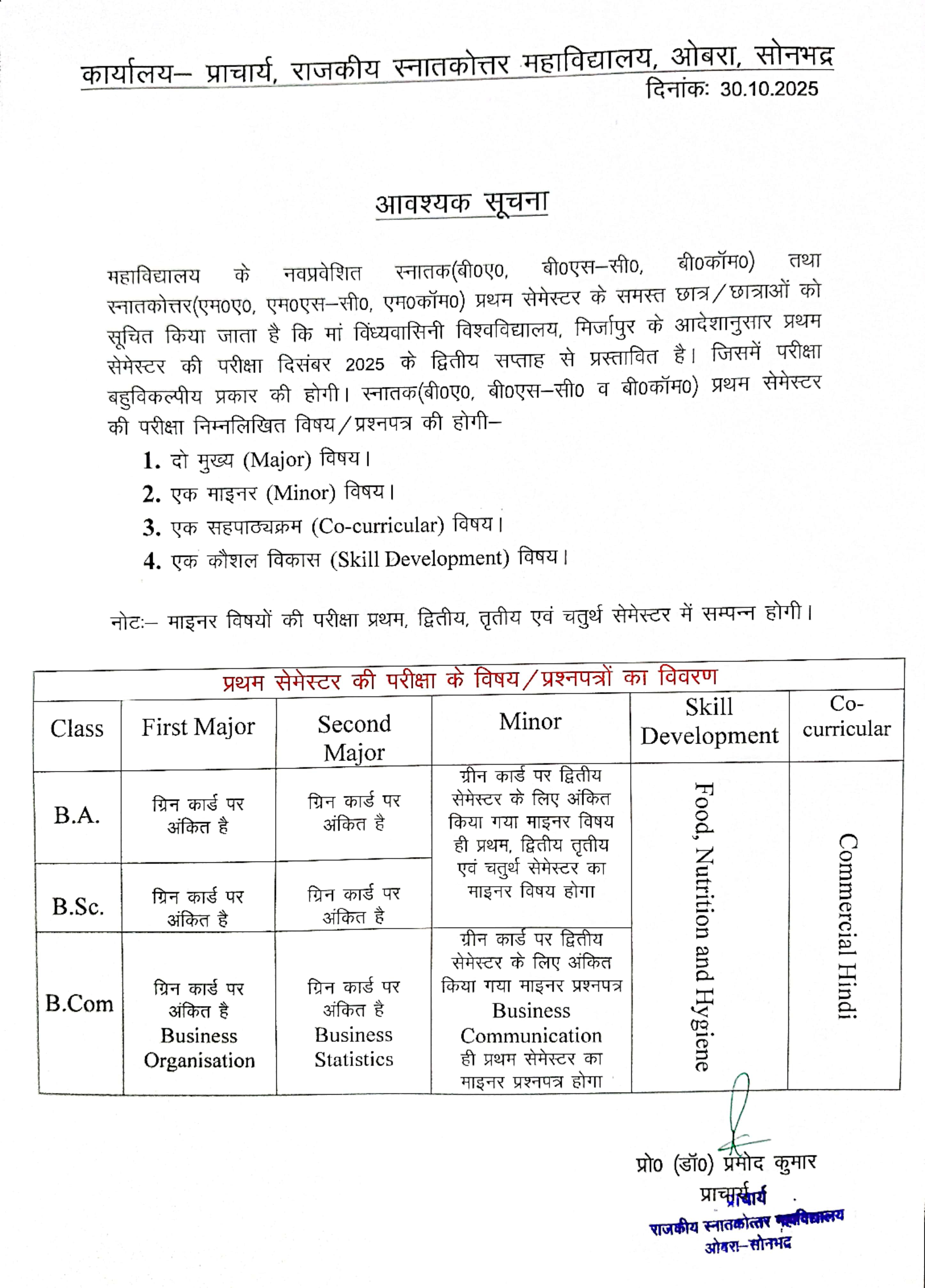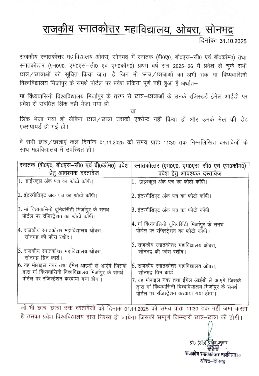 I welcome you at website of Govt. P.G. College Obra Sonebhadra (UP). I am much delighted that you have preferred this College for your academic pursuit after completion of your course. Our mission is to develop this College as a catalyst of change and versatile growth to prepare the students to think critically and act responsibly in a rapidly changing global environment.