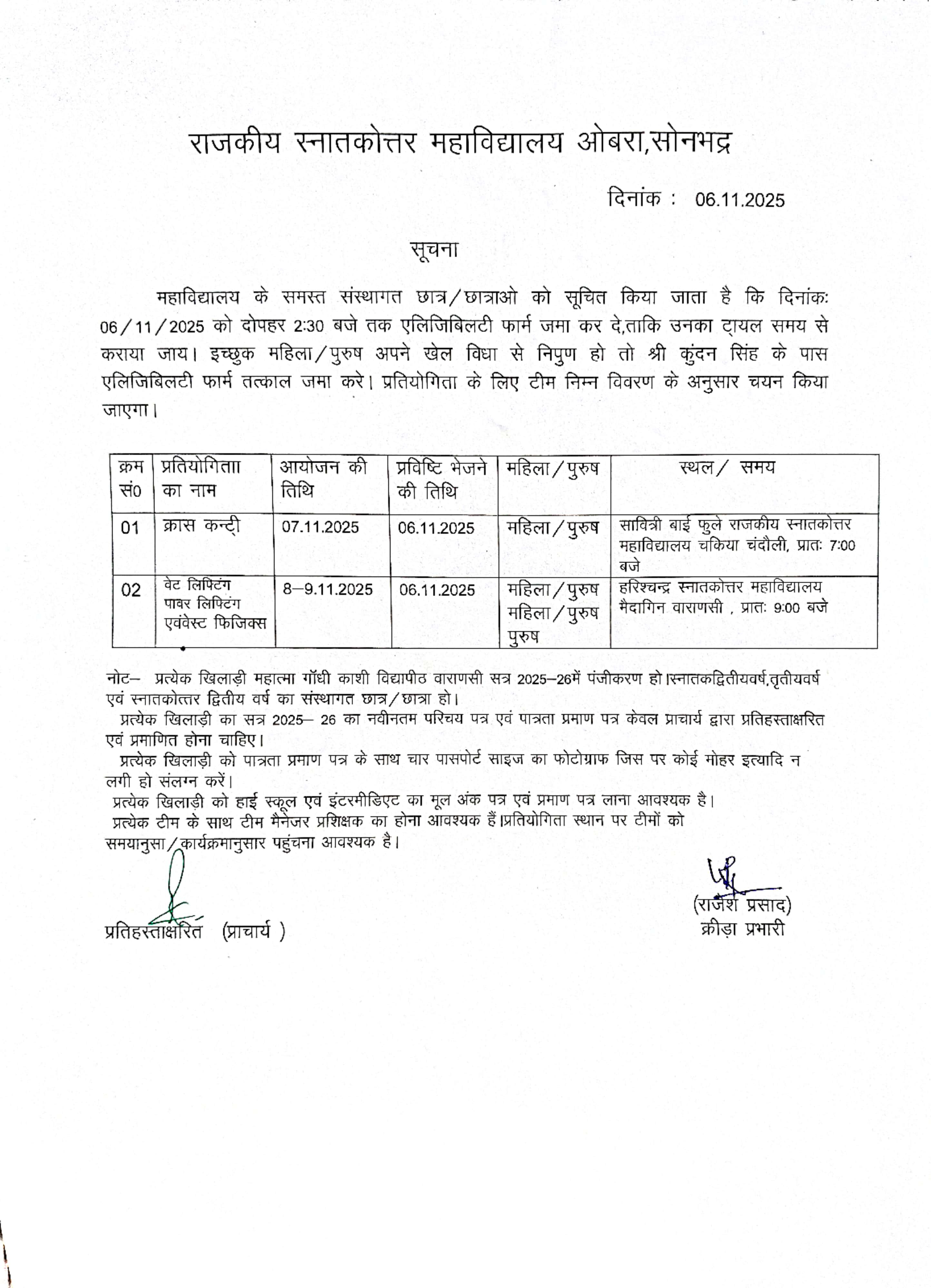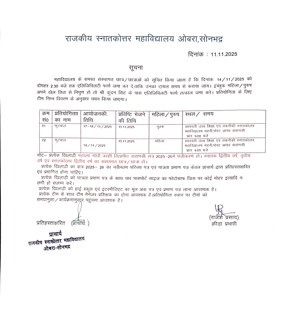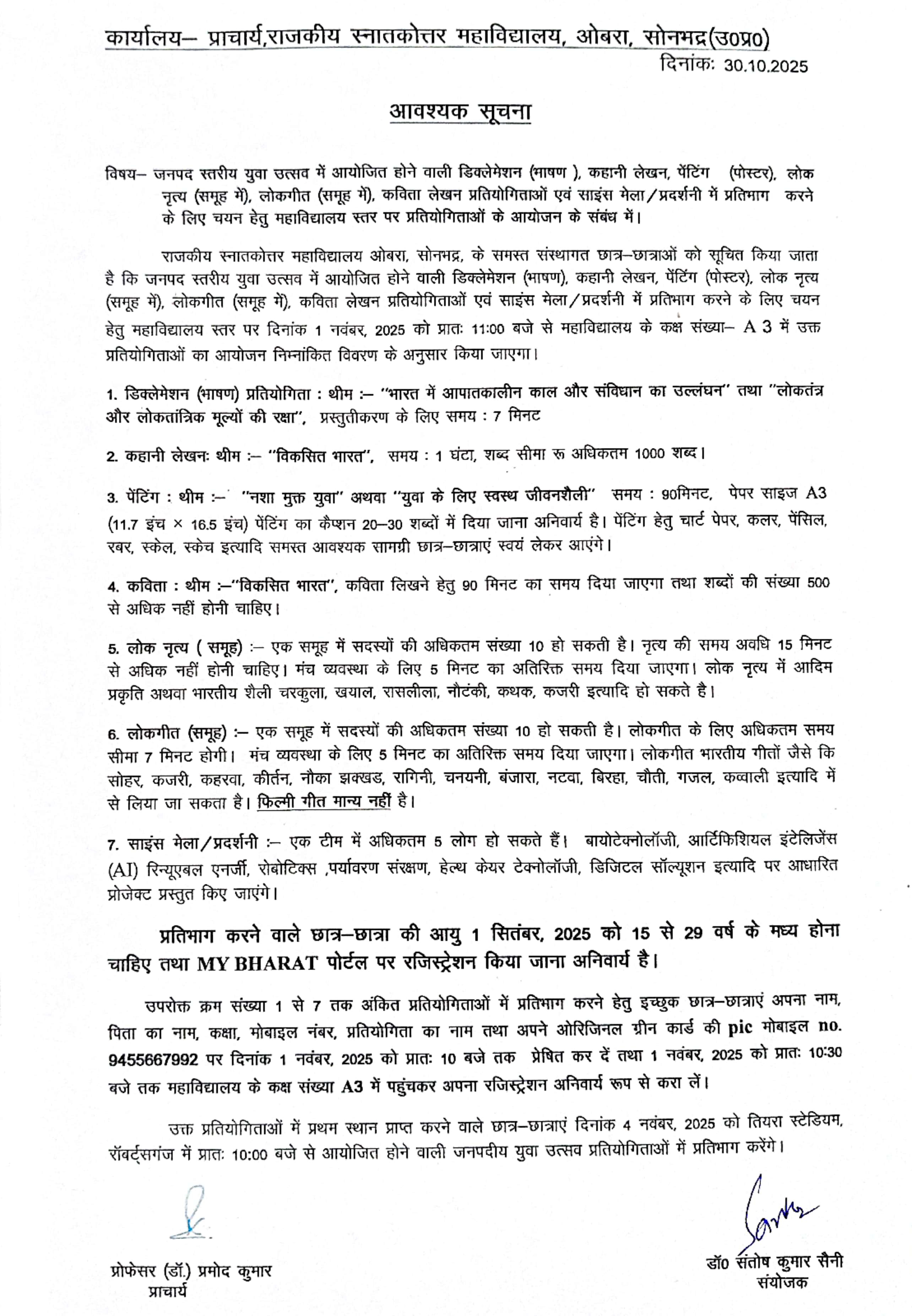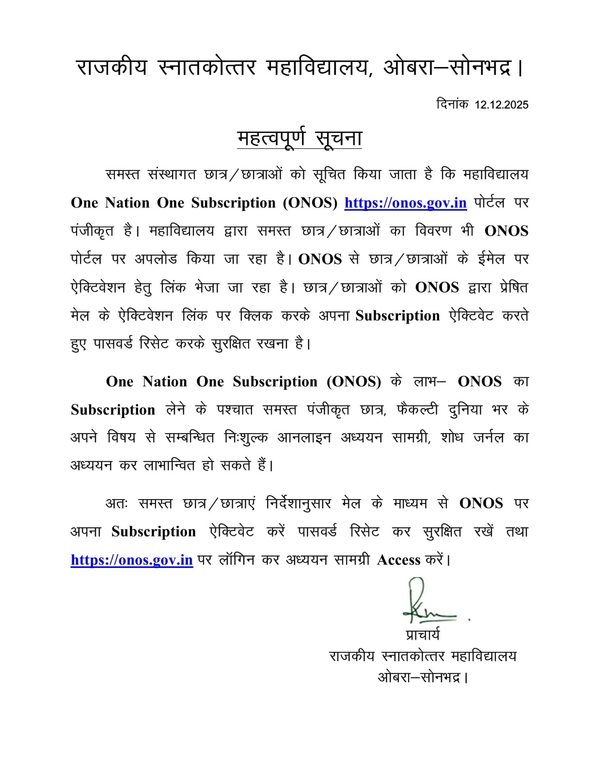 We, at Govt. P.G. College Obra Sonebhadra (UP), have highly qualified, dedicated and committed faculty who are ever ready to guide students, sharpen their skills and develop their personality. The College library has over 45000 books in different disciplines to provide intellectually stimulating resource material and a very conducive and calm environment to enhance the learning abilities. The Cultural, academic and sports councils of this college organize vibrant, scholastically thoughtful, and exciting events to enhance the extra-curricular activities of the students.