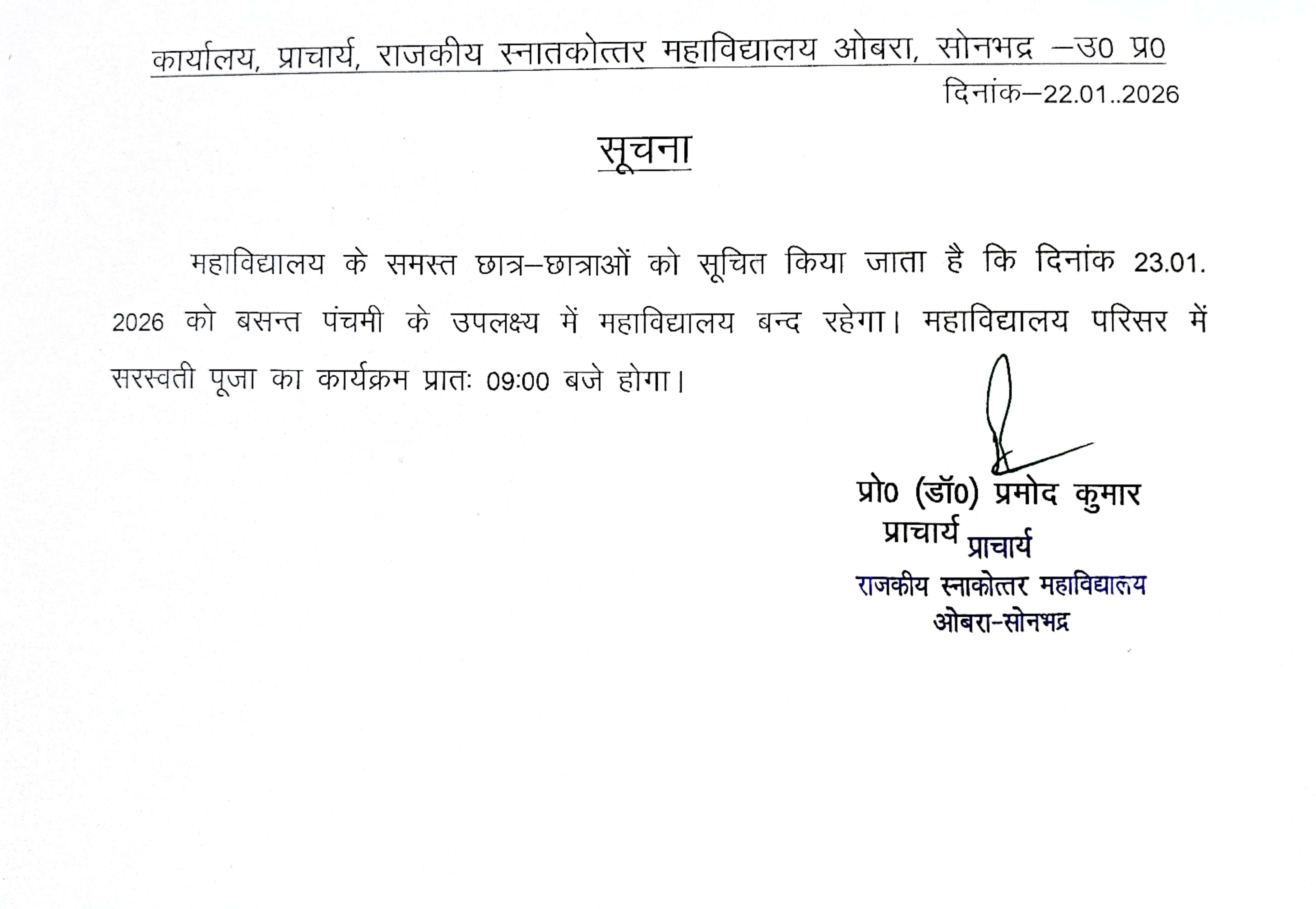 बसंत पंचमी के उपलक्ष में महाविद्यालय दिनांक 23 जनवरी 2026 को बंद रहेगा