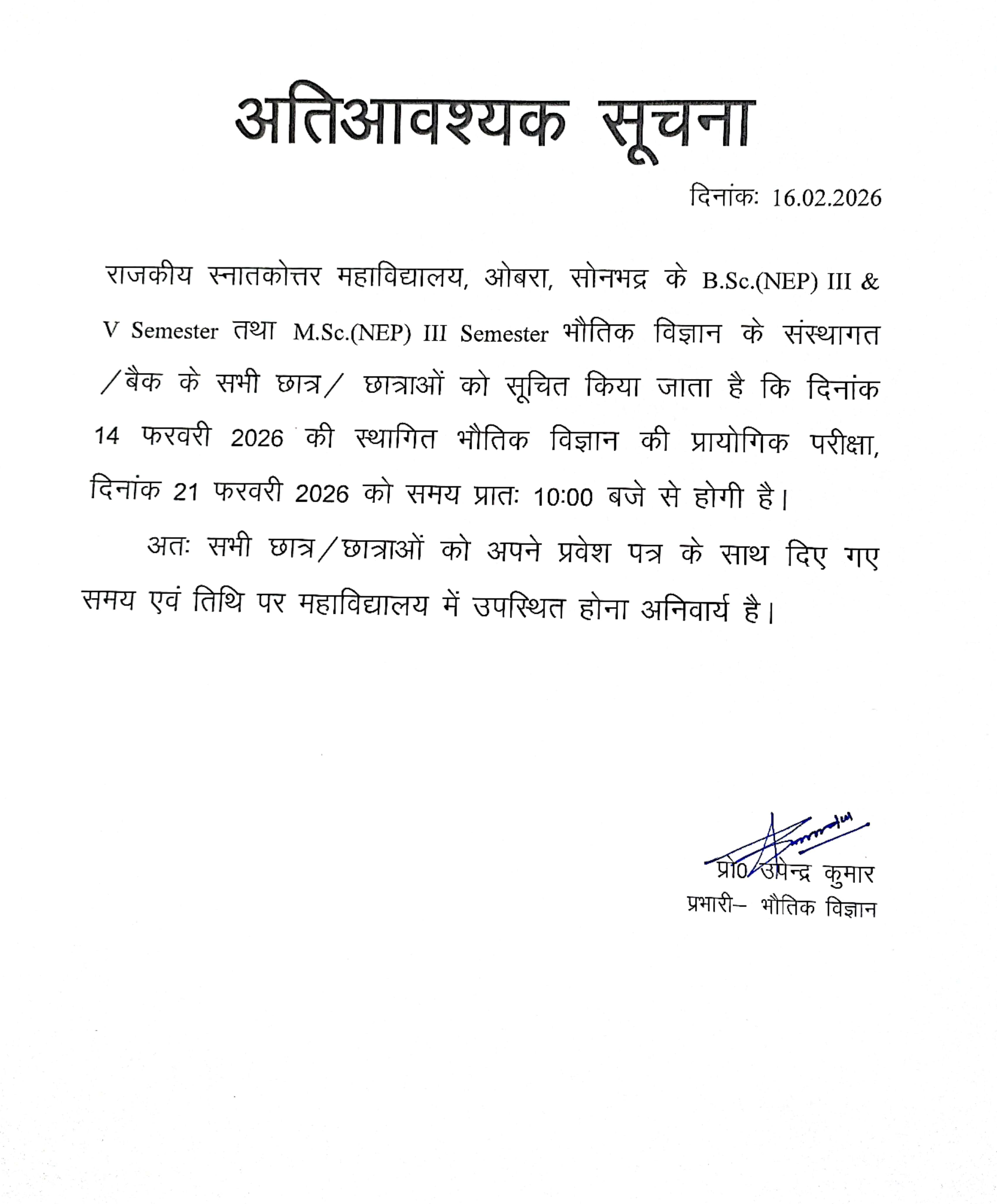 M.Sc III, B.Sc III & V (Physics) की प्रायोगिक परीक्षा के संदर्भ में आवश्यक सूचना
