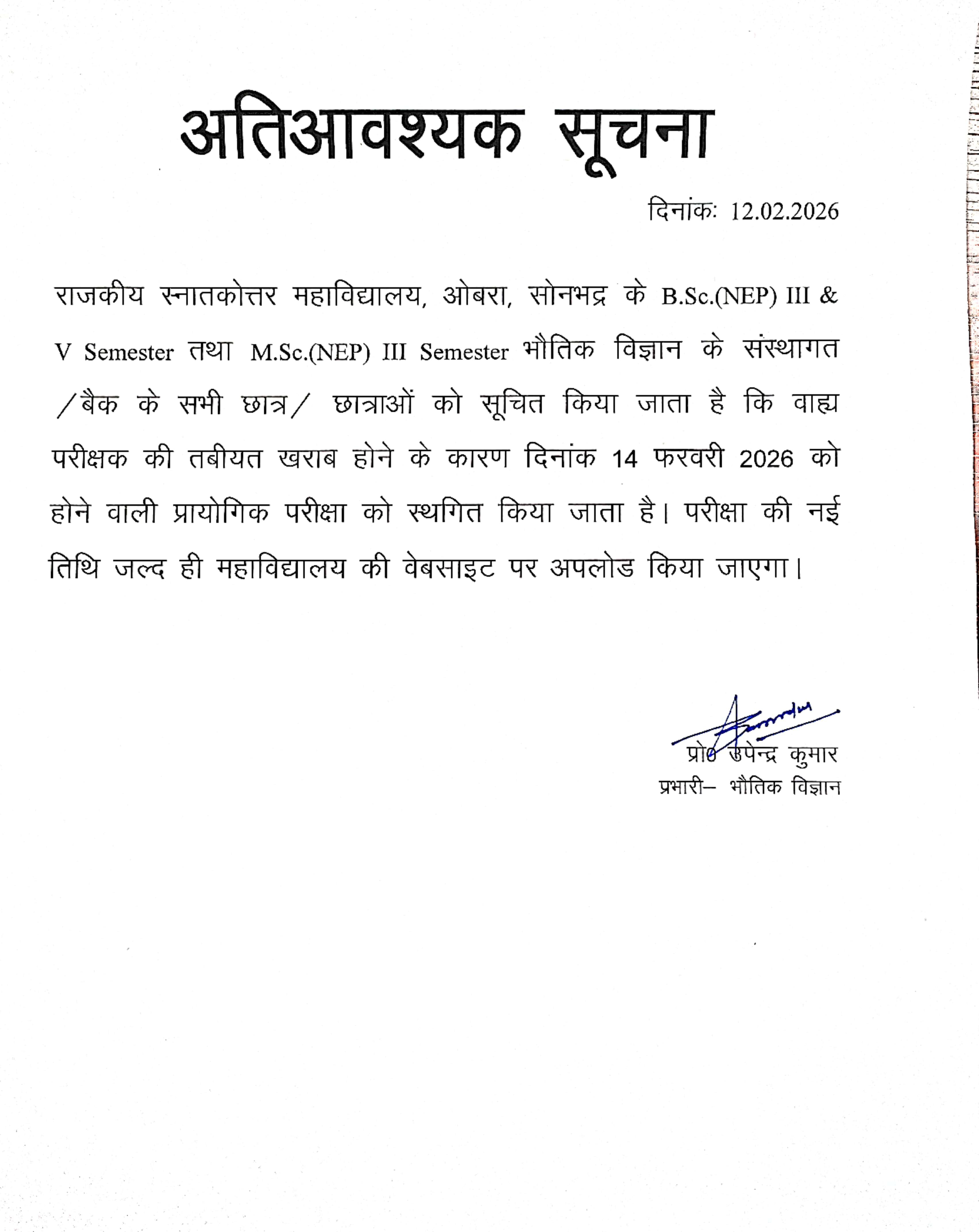 M.Sc III, B.Sc III & V (Physics) की प्रायोगिक परीक्षा के स्थगन के संदर्भ में आवश्यक सूचना
