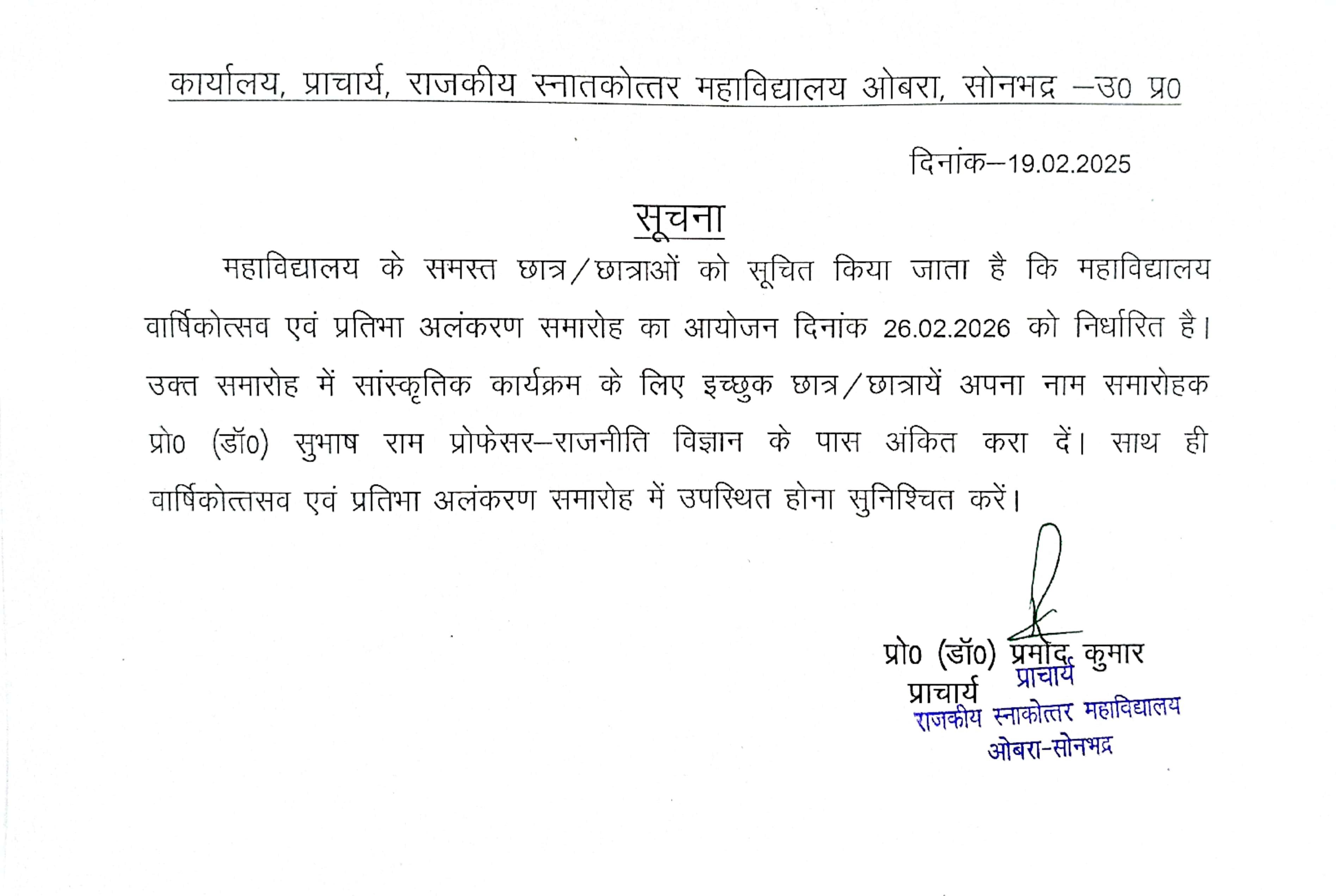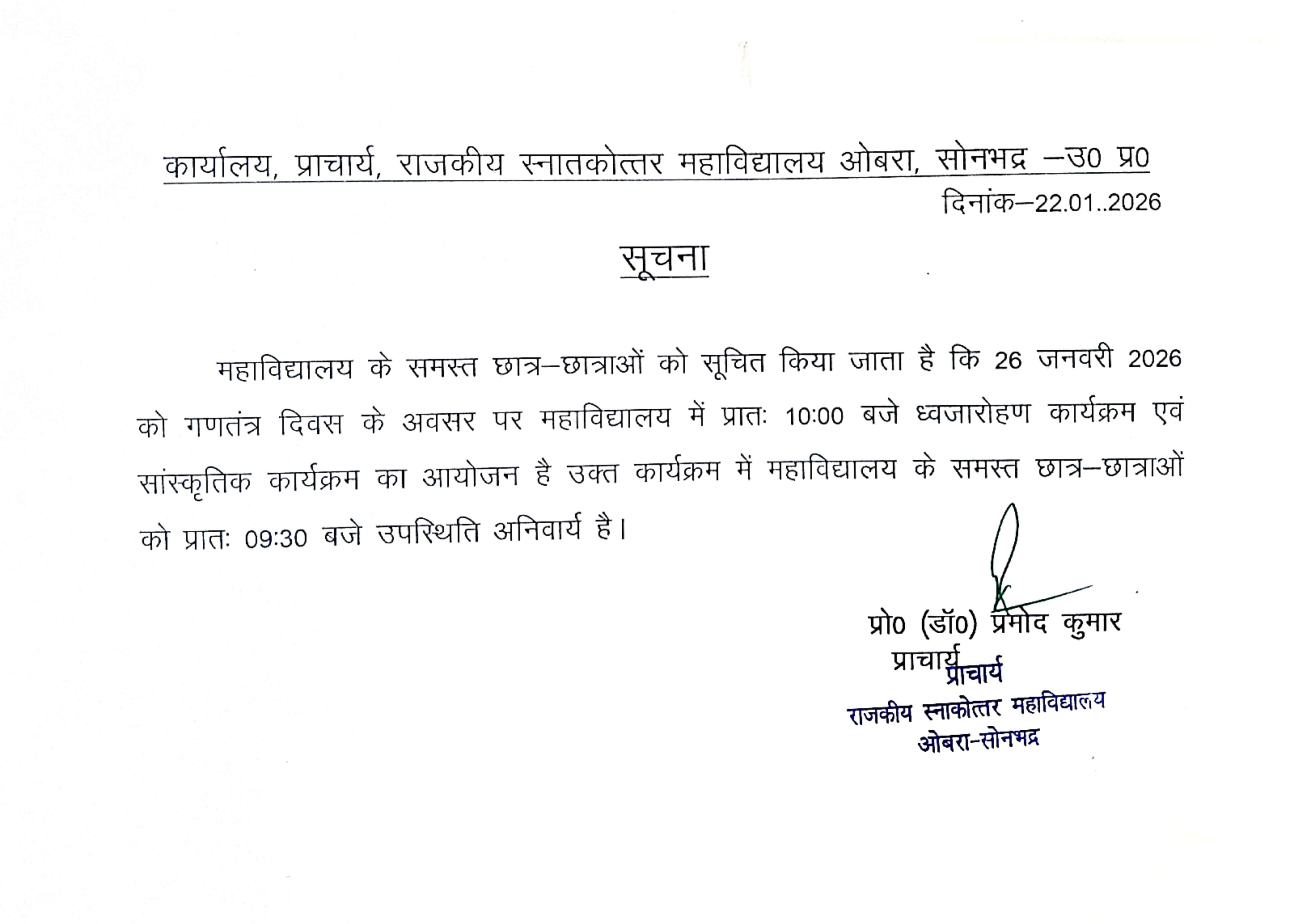 राजकीय स्नातकोत्तर महाविद्यालय ओबरा,सोनभद्र के इग्नू सेंटर में प्रवेश प्रारंभ