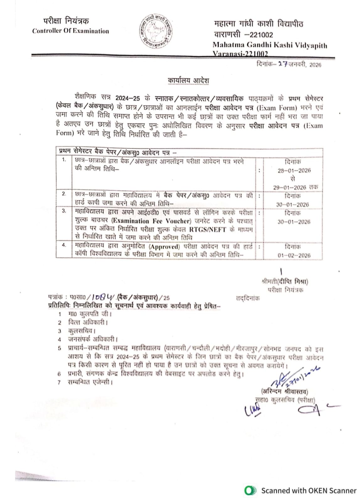 स्नातक तथा स्नातकोत्तर प्रथम सेमेस्टर का परीक्षा फॉर्म भरने की तिथि 4 जनवरी 2026 से बढ़कर 7 जनवरी 2026 कर दिया गया है