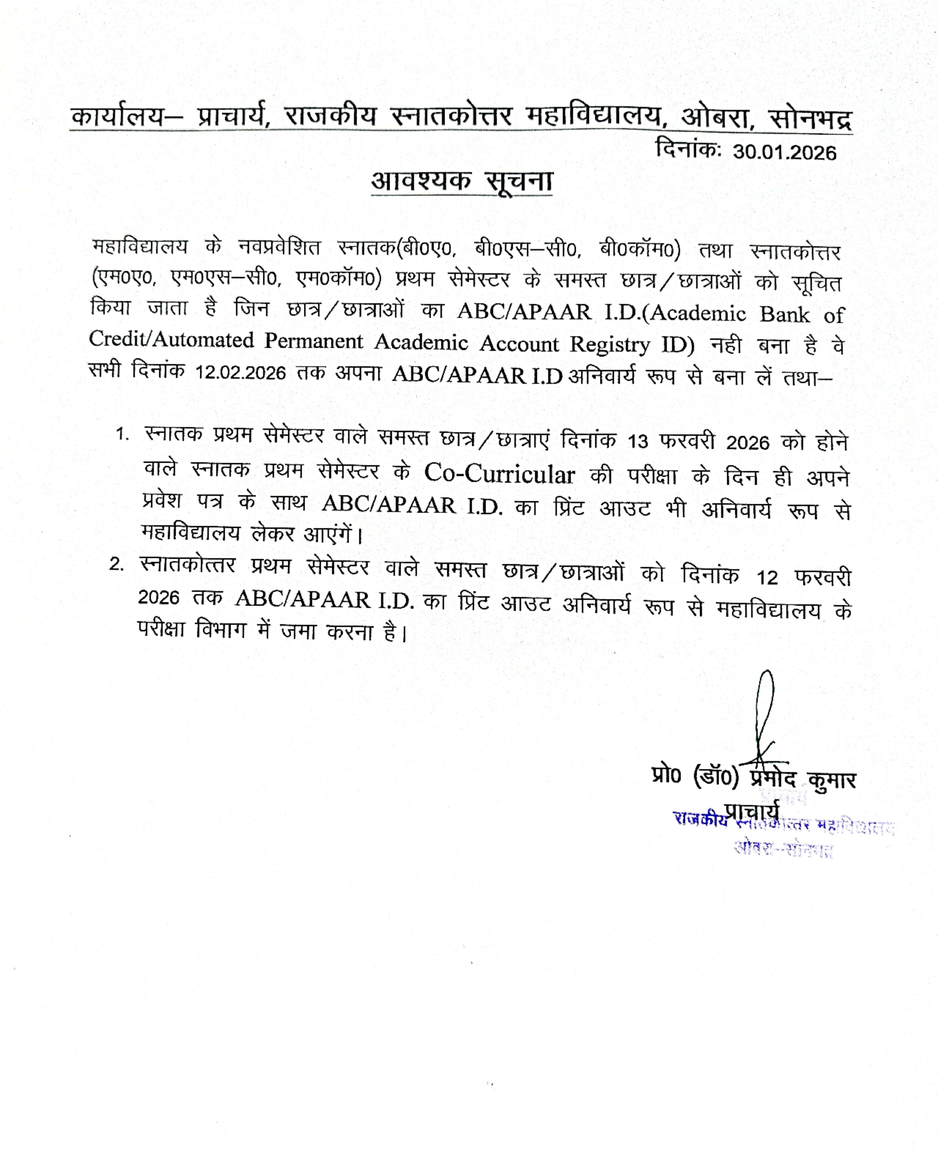 स्नातक तथा स्नातकोत्तर प्रथम सेमेस्टर सत्र 2025-26 में नवप्रवेशित छात्र-छात्राओं हेतु अति आवश्यक सूचना
